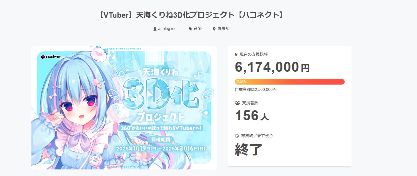 【VTuber天海くりね】3Dモデル制作プロジェクトのクラウドファンディング目標額246%の617万円の支援が集まり終了! すべてのストレッチゴールを達成!【ハコネクト】