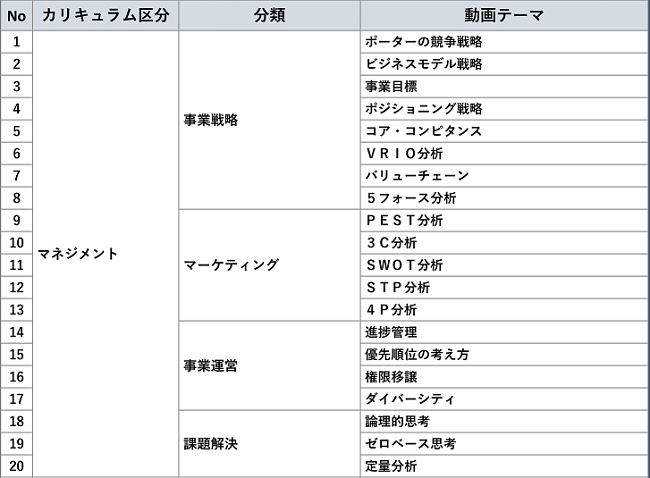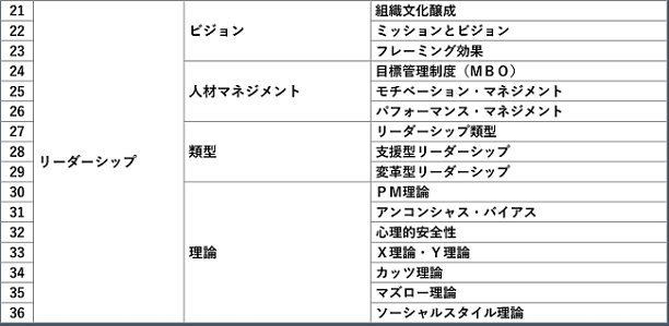 管理職に必須の36のテーマを「マネジメント」と「リーダーシップ」に区分し、カリキュラムを作成しました。さらに「マネジメント」を「事業戦略」「マーケティング」「事業運営」「課題解決」に、「リーダーシップ」を「ビジョン」「人材マネジメント」「類型」「理論」に分類。必要なテーマを選んで視聴することも、順番に視聴し体系的に学習することも可能です。