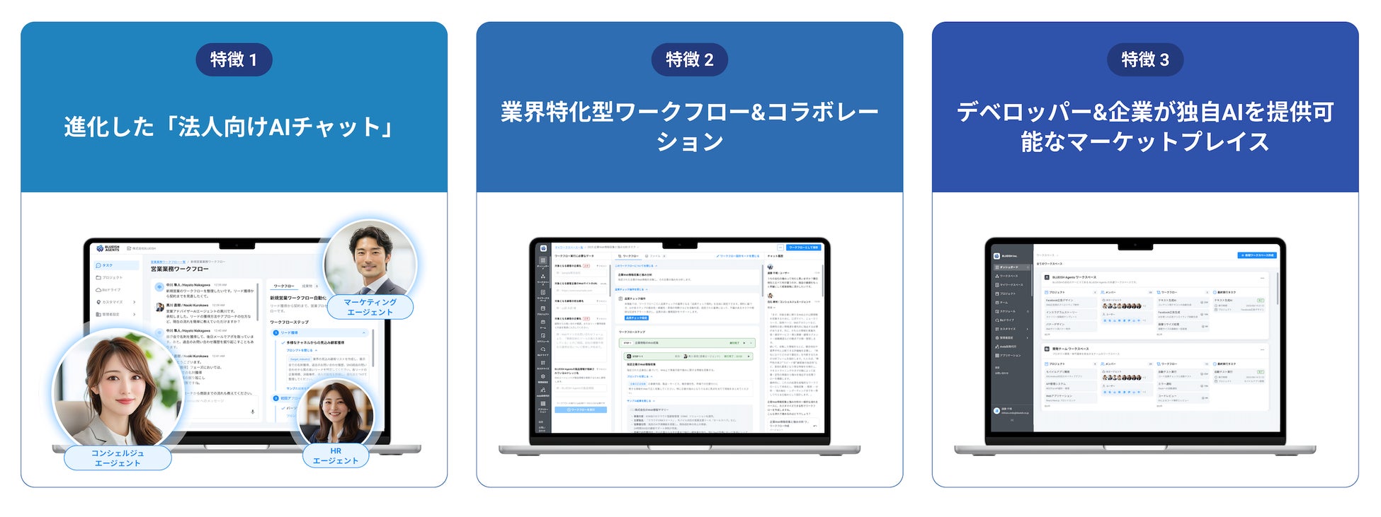 「AIを雇う」という新発想のもと、企業が領域特化型AIを自由に導入できる「AIエージェントマーケットプレイス」の仕組みを導入。即時の業務効率化に加え、デベロッパーや企業が独自エージェントを公開し、新たな収益モデルを創出。自社専用はもちろん、他社向け販売まで柔軟に対応し、オープンなエコシステムでイノベーションを加速します。