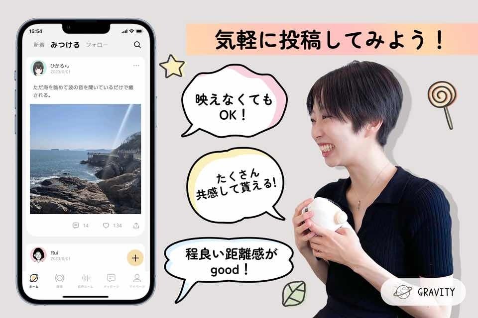 DL数250万突破!(※)何気ない日常を気軽にシェアでき、”トレンド寸前の次世代SNS”として話題のSNS「GRAVITY(グラビティ)」。声とチャットで交流できる「音声ルーム」、興味のあるコミュニティで繋がる「趣味の惑星」や相性の良いユーザーと繋がるための「性格診断テスト」などコンテンツが盛りだくさん!共通の趣味や自分と似た価値観をもつ友達がみつかる匿名性の高いSNSです。