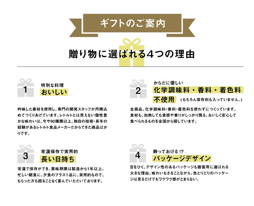 | 【トピックス】 ・身近な方への贈り物に、自分用にもレトルトを ・ギフトセットは全10種類、贈り物にオススメの理由とは ・用途に合わせたギフトラッピング |