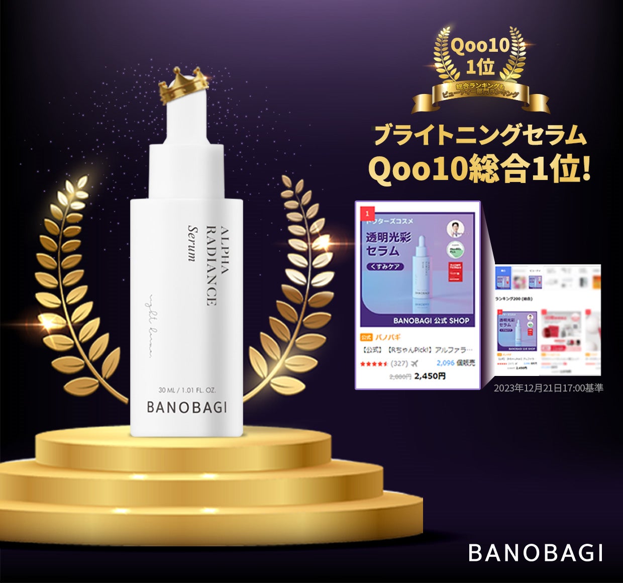 バノバギコスメ、美肌の超進化 「アルファラディアンスセラム」Qoo10総合ランキングおよびビューティー部門のランキングで1位*達成!*2023.12.21基準