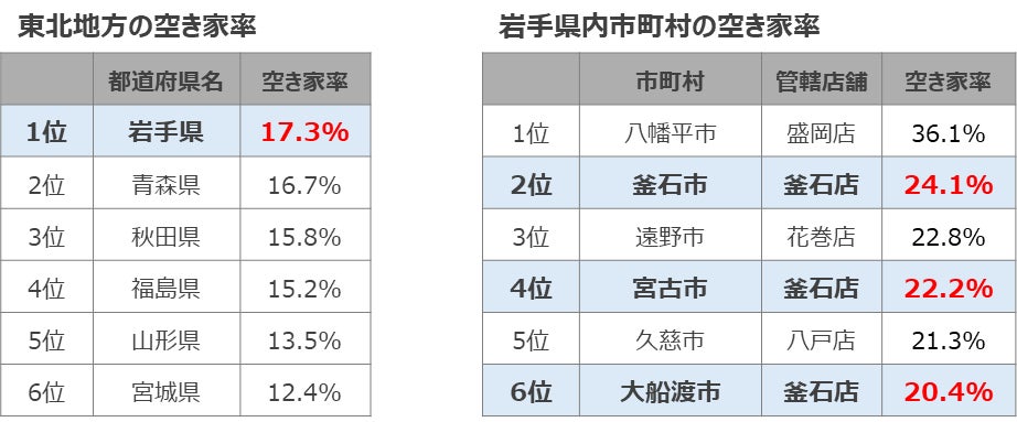 このたび新店舗を構える岩手県は、東北地方で最も空き家率が高くさらに、県内で2番目に空き家率が高い釜石市*²に店舗を構え、県内沿岸部の市町村を中心に管轄します