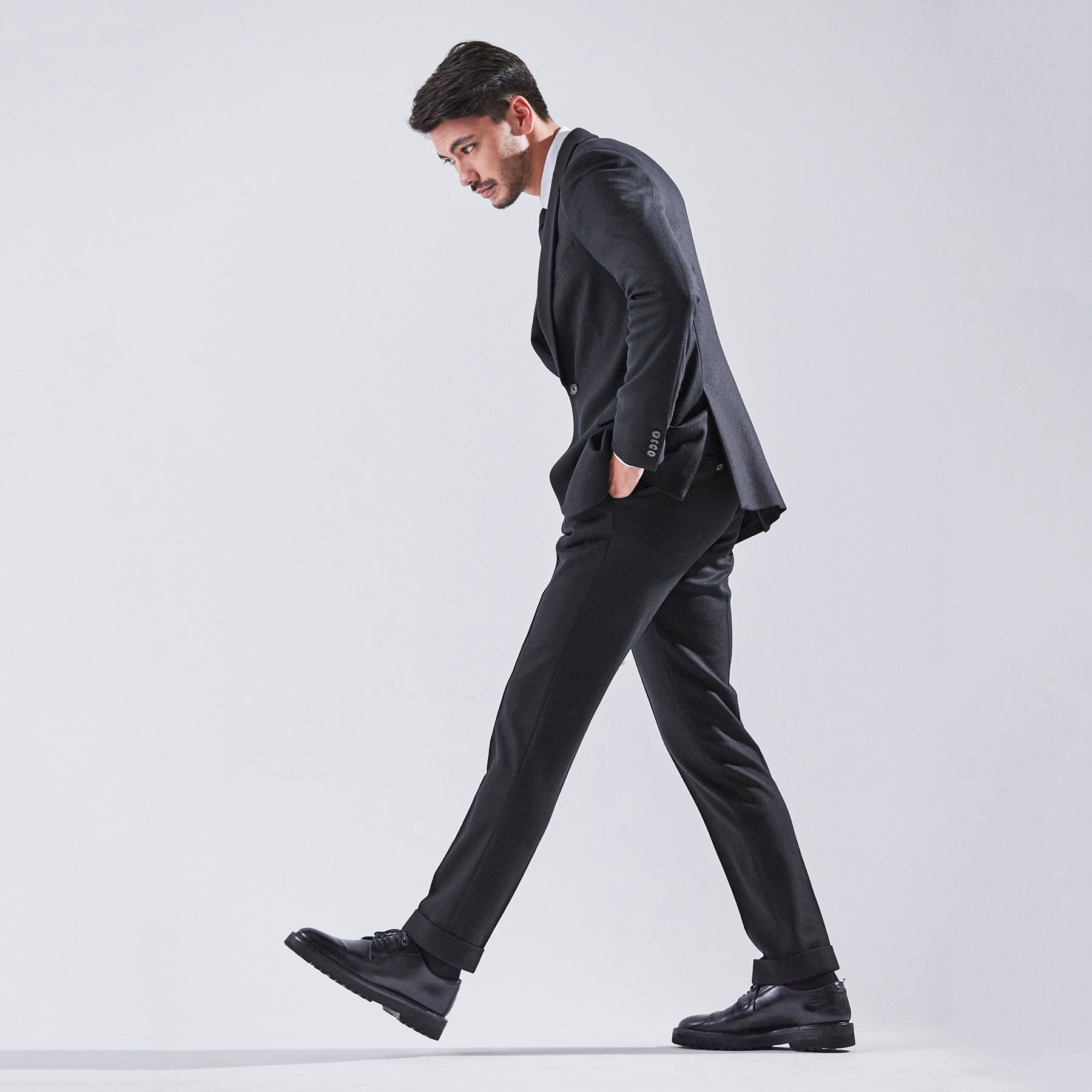 裾にかけて絞りを効かせたテーパードで、どなたでもスタイリッシュに穿いていただけるこだわりのシルエット。出張でもアイロンがいらないピンタック仕様のセンタークリースで、出先でも常に足のラインを美しく保ちます。