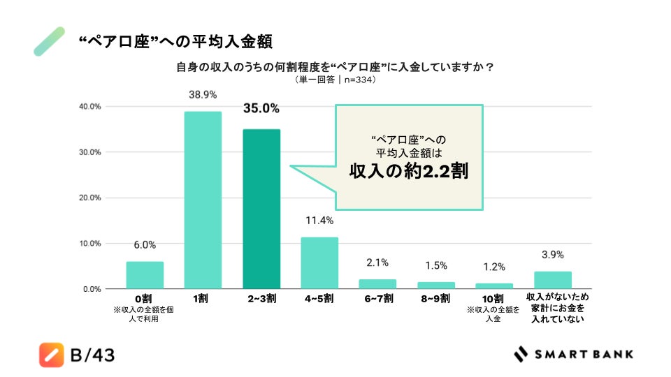 ペア口座利用に、自身の収入のうち何割程度を“ペア口座”に入金しているか質問したところ、平均で収入の約2.2割を入金していることが分かりました。