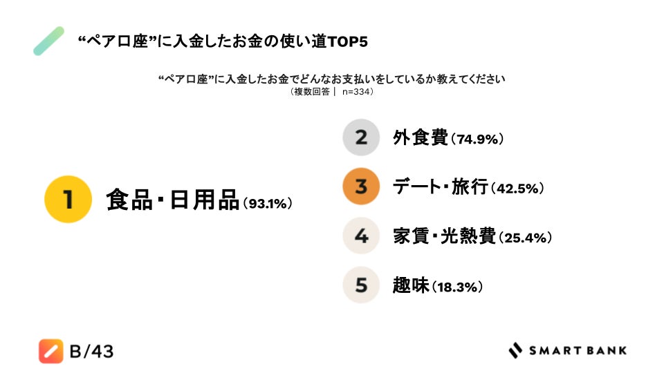 “ペア口座”に入金したお金の使い道TOP3は、1位「食品・日用品」2位「外食費」3位「デート・旅行」