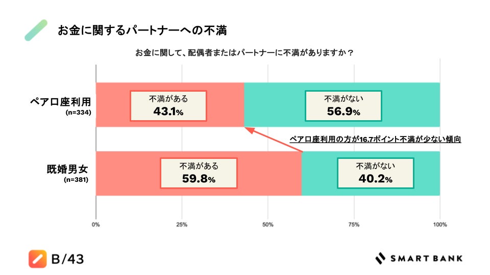 パートナーへのお金の不満、一般的な夫婦の59.8%に比べ、“ペア口座”ユーザーは16.7ポイント低い結果に