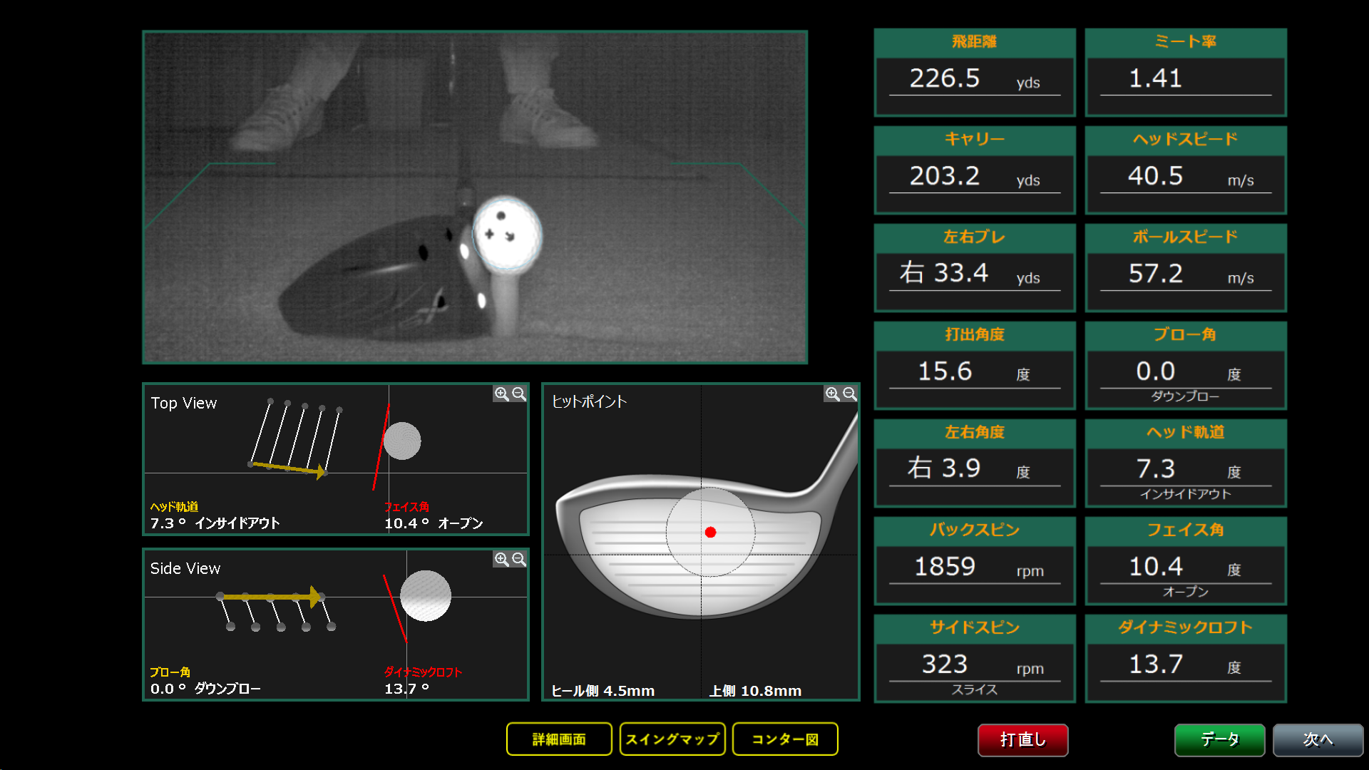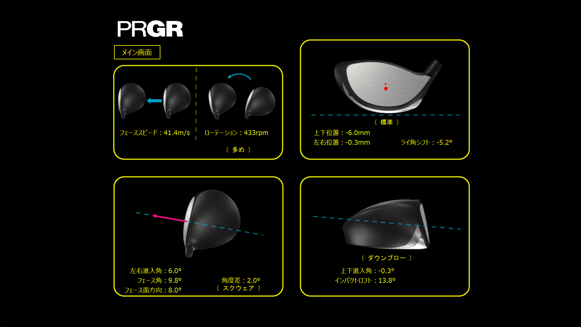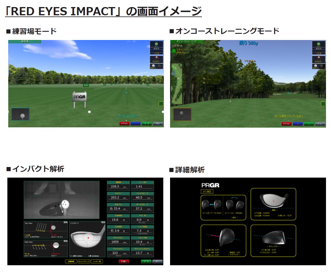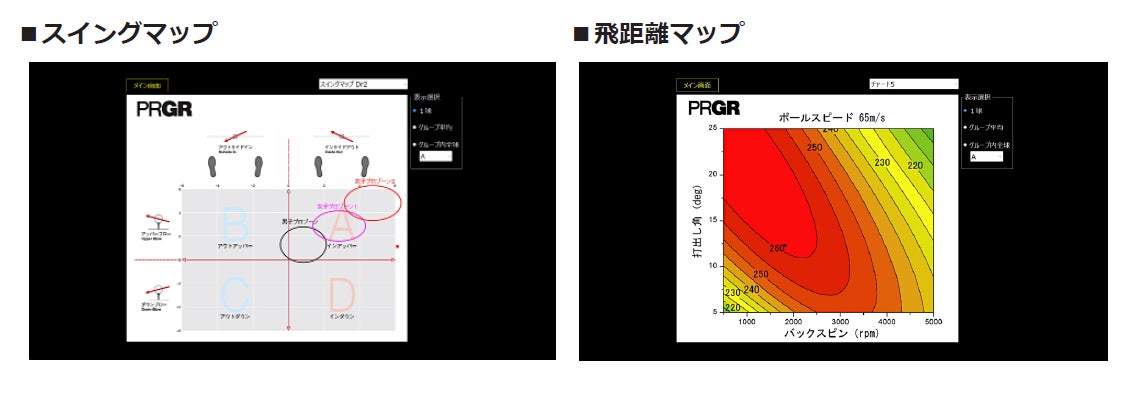 「RED EYES IMPACT」は、(株)ディテクトと共同開発した測定器で、従来の測定器「RED EYES ROBO(ロボ)」ではヘッド挙動測定器と初期弾道測定器の2つの測定器が必要だったものを1つにまとめてコンパクト化。秒間最大5,000コマ、1/50,000秒のシャッタースピードのハイスピードカメラを搭載したことで、インパクト時のブロー角、クラブパス、フェースアングル、ダイナミックロフト、ヒットポイントなどが可視化でき、より詳細な解析が可能となりました。また、ゴルファーのスイングタイプを分類する「スイングマップ※」、ボール初速と打ち出し角、スピン量、飛距離の関係性をコンター図で表した「飛距離マップ」などPRGR独自の解析機能や、バーチャルゴルフ場で実戦的な練習ができるオンコーストレーニングモードなどの機能も備えています。