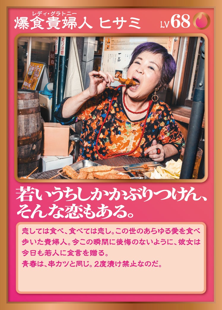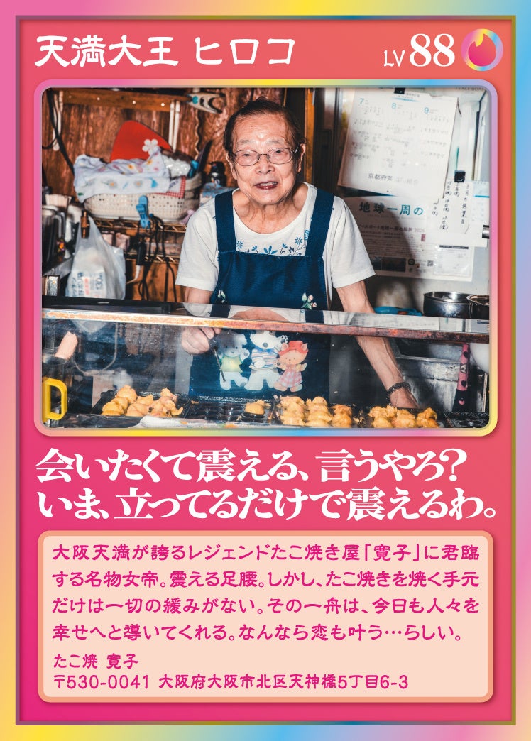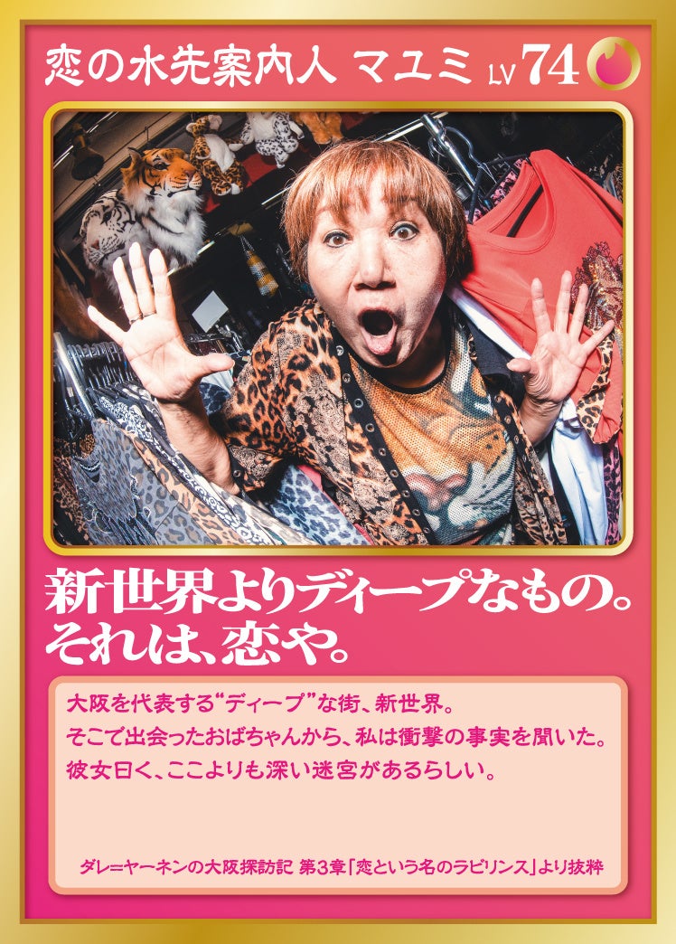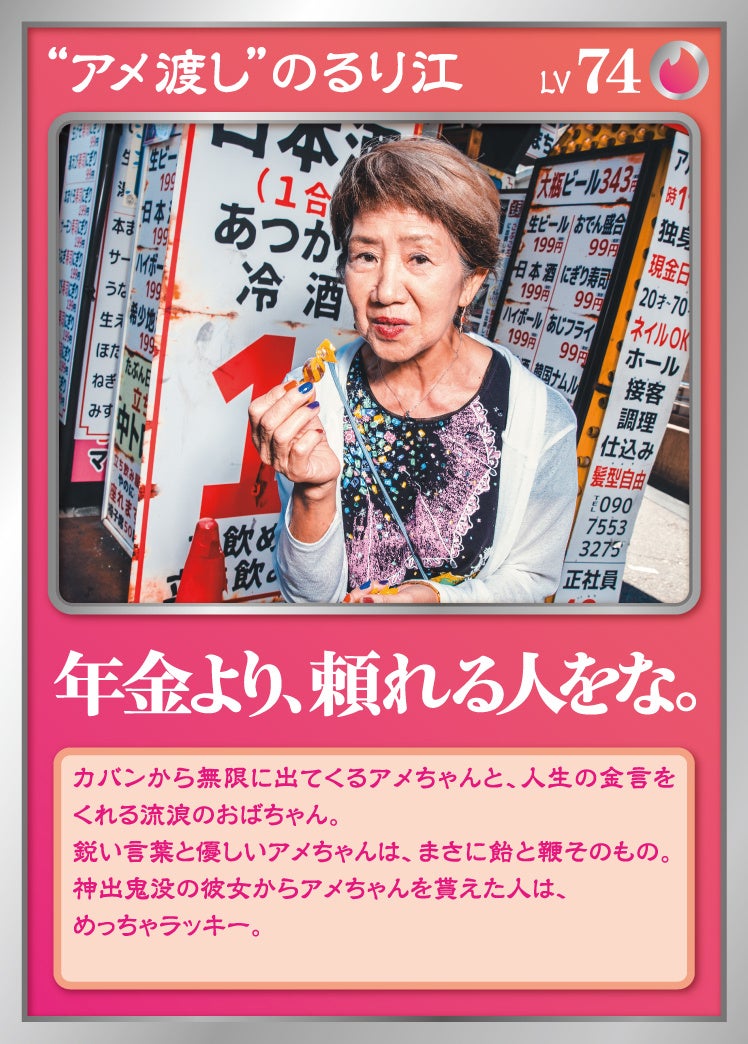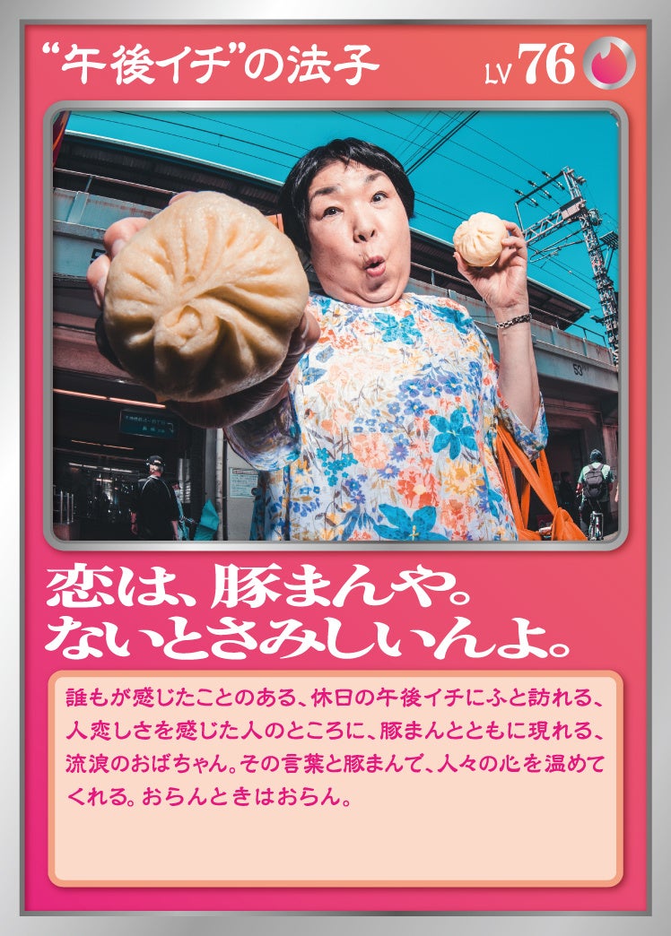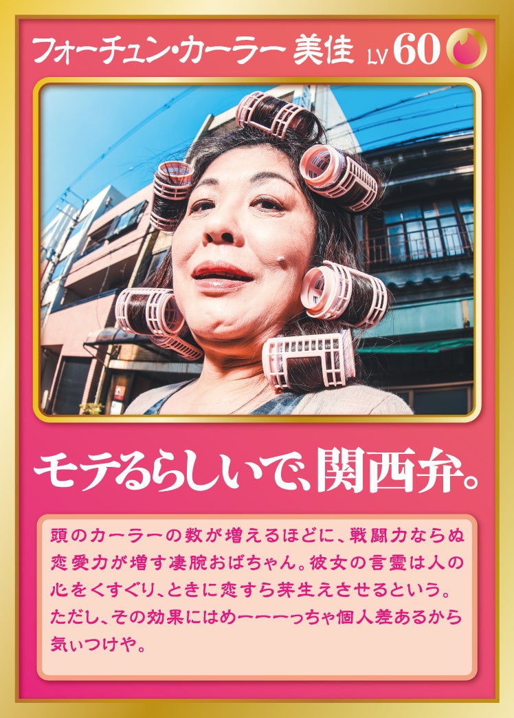 キャンペーン期間中には、梅田アドストリートと広告に登場いただいた“オバチャン”の営むお店にて、“オバチャン”たちの金言を掲載した12種類の「金言トレーディングカード(通称:金言トレカ)」を無料で配布いたします。トレーディングカードには、有料プランのTinder GoldやTinder Plus、または有料サービスのブースト、 Super Likeなどをお試しいただけるクーポンが記載されているカードもあり、若者たちの「新しい出会い」を応援します。