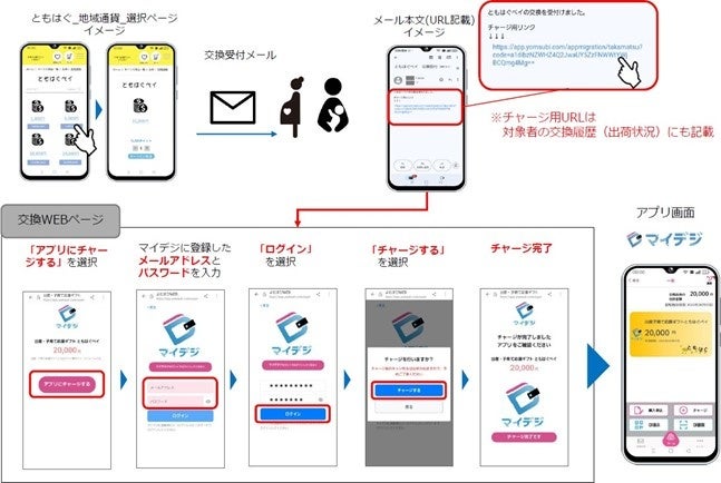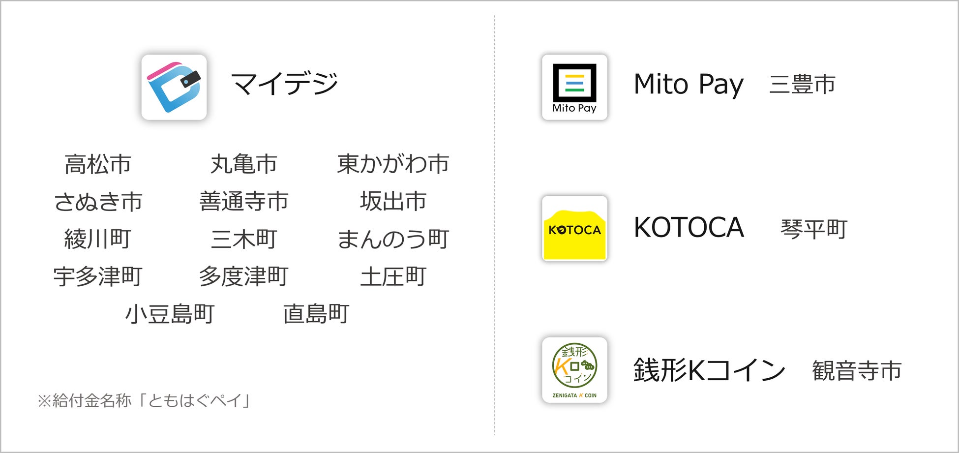 受取り可能なアプリは、デジタル地域通貨事業を既に取り組んでいる既存の自治体では、当社がシステム提供を行った各市町オリジナルのアプリを使用し、未導入の自治体は当社とサイテックアイ社が令和4年度高松市のデジタル田園都市国家構想で構築したデジタル地域通貨アプリ「マイデジ」で受取りすることが出来るようになっています。