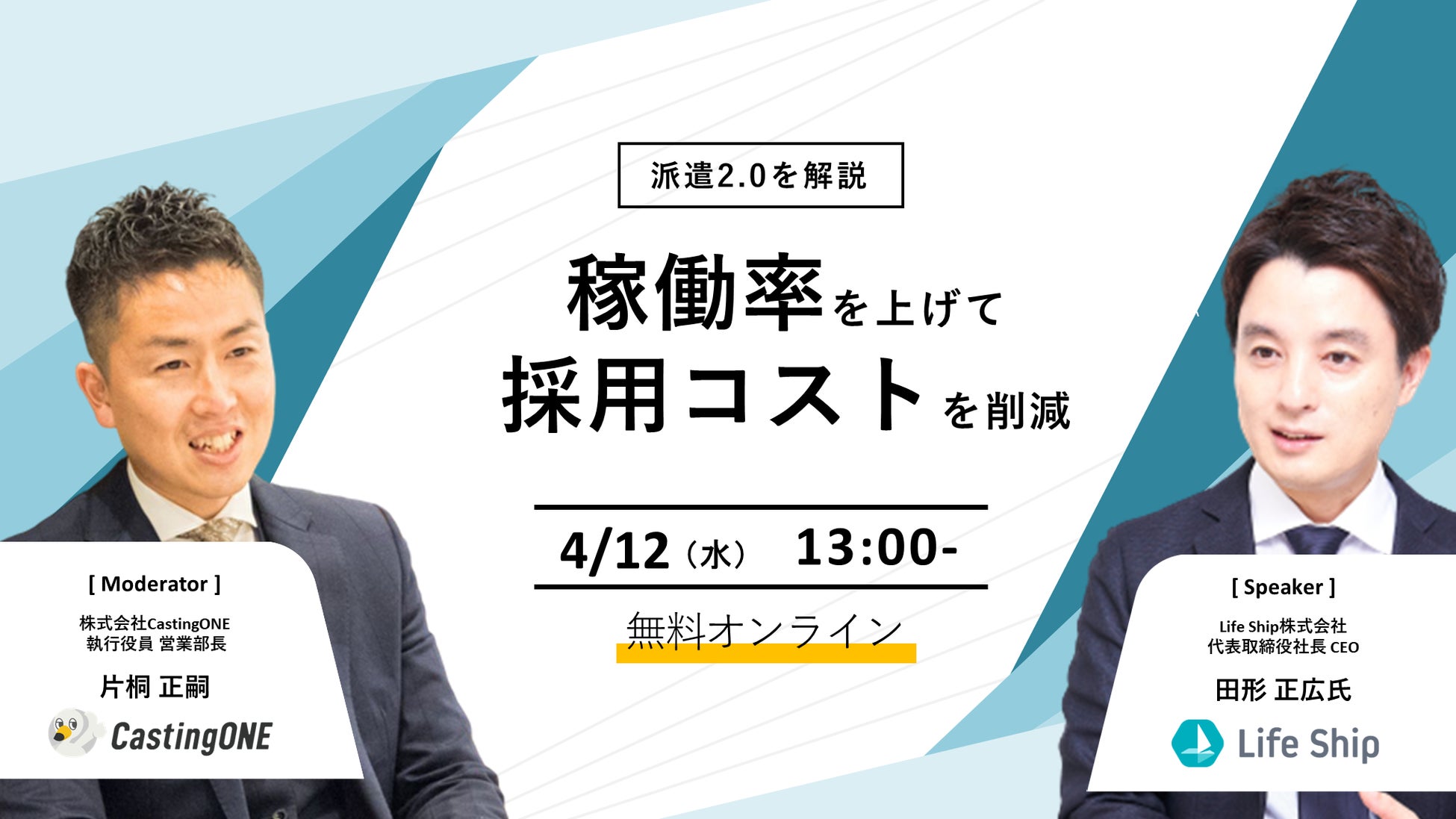 株式会社CastingONE(キャスティングワン、本社:東京都千代田区、代表取締役:野澤 怜司)は、Life Ship株式会社と共催ウェビナー「派遣2.0とは?稼働率UP×採用コスト削減で売上を上げる手法」を開催いたします。