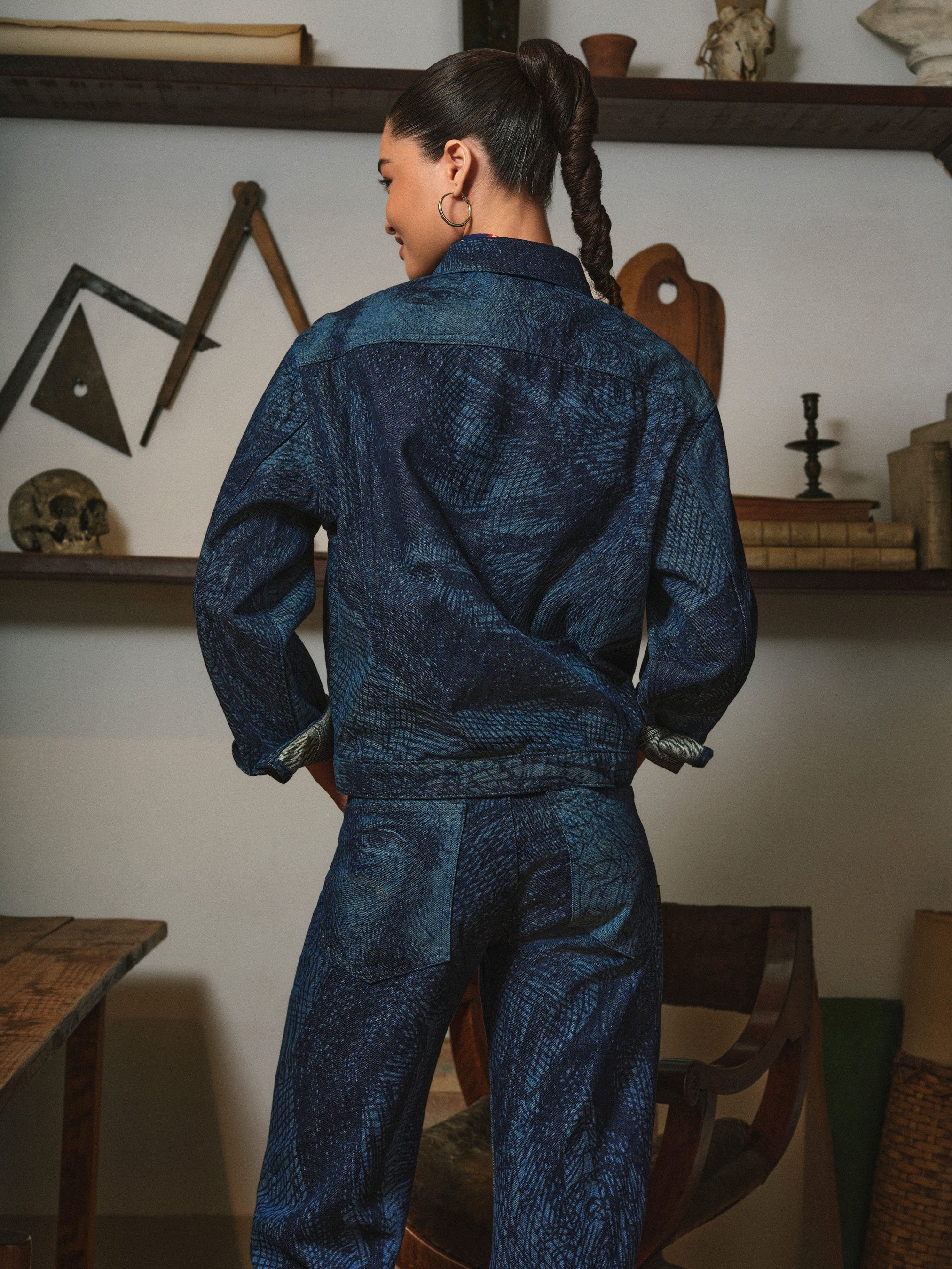 この限定ユニセックス・コレクションは、ユニークなデニムジャケット2点、ジーン ズ2点、デニムシャツ、パーカーという構成で、丹念にデザインされた計6点から成り⽴ちます。現在の展⽰の⽬⽟であるレンブラントのもっとも有名なエッチングのひとつからインスピレーションを受けたプリントが、レーザー技術を駆使してデニムに施されています。