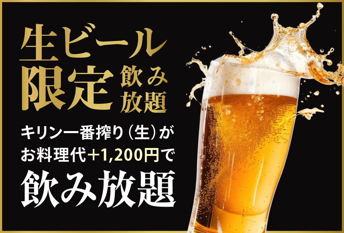 生ビール(キリン一番搾り)の飲み放題を、お料理代に+1,200円で追加することができます。ご好評につき、定番化に加えてグループ内で飲みたい方だけが注文できるようになりました。