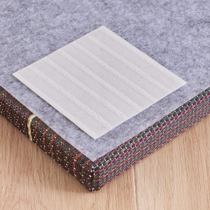 82×82cmのサイズで、女性一人でも軽々と持ち運べる重さです。裏面には滑り止め加工を施しており、フローリングに置くだけで設置完了。使わないときは立て掛けて収納することも可能です。