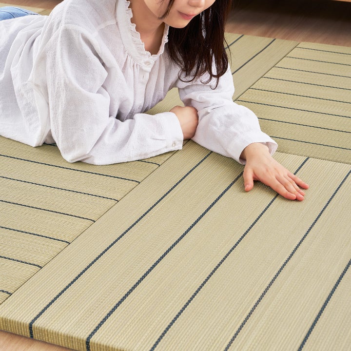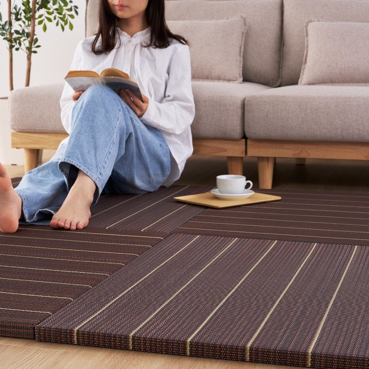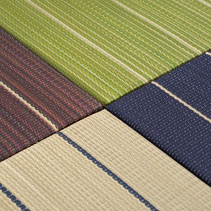 い草の心地よい質感はそのままに、独自のストライプ柄でスタイリッシュな雰囲気に仕上げました。カラーはナチュラル、ブラウン、グリーン、ブラックの4色展開。単色使いはもちろん、複数色を組み合わせることで、お部屋に遊び心をプラスできます。