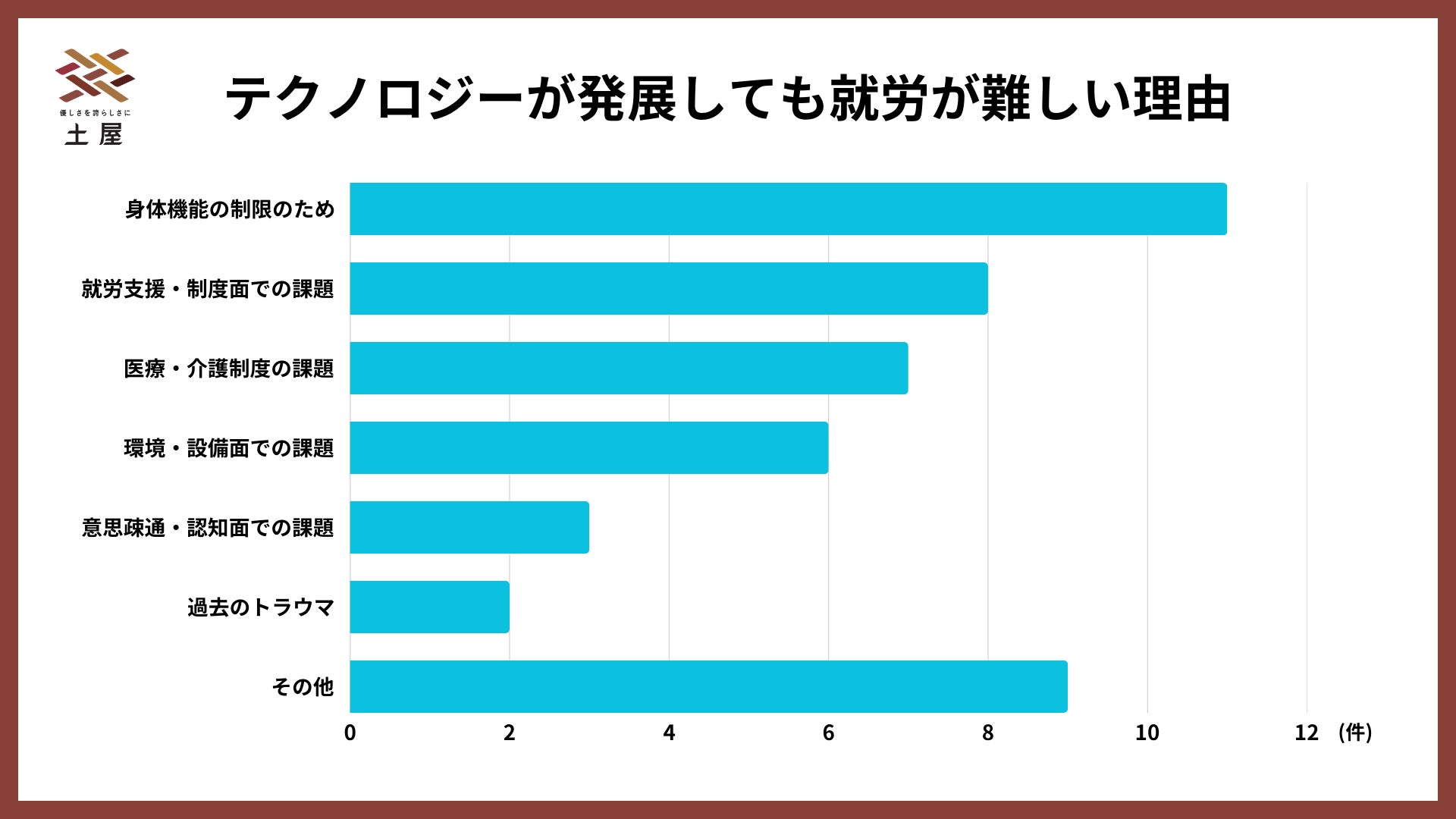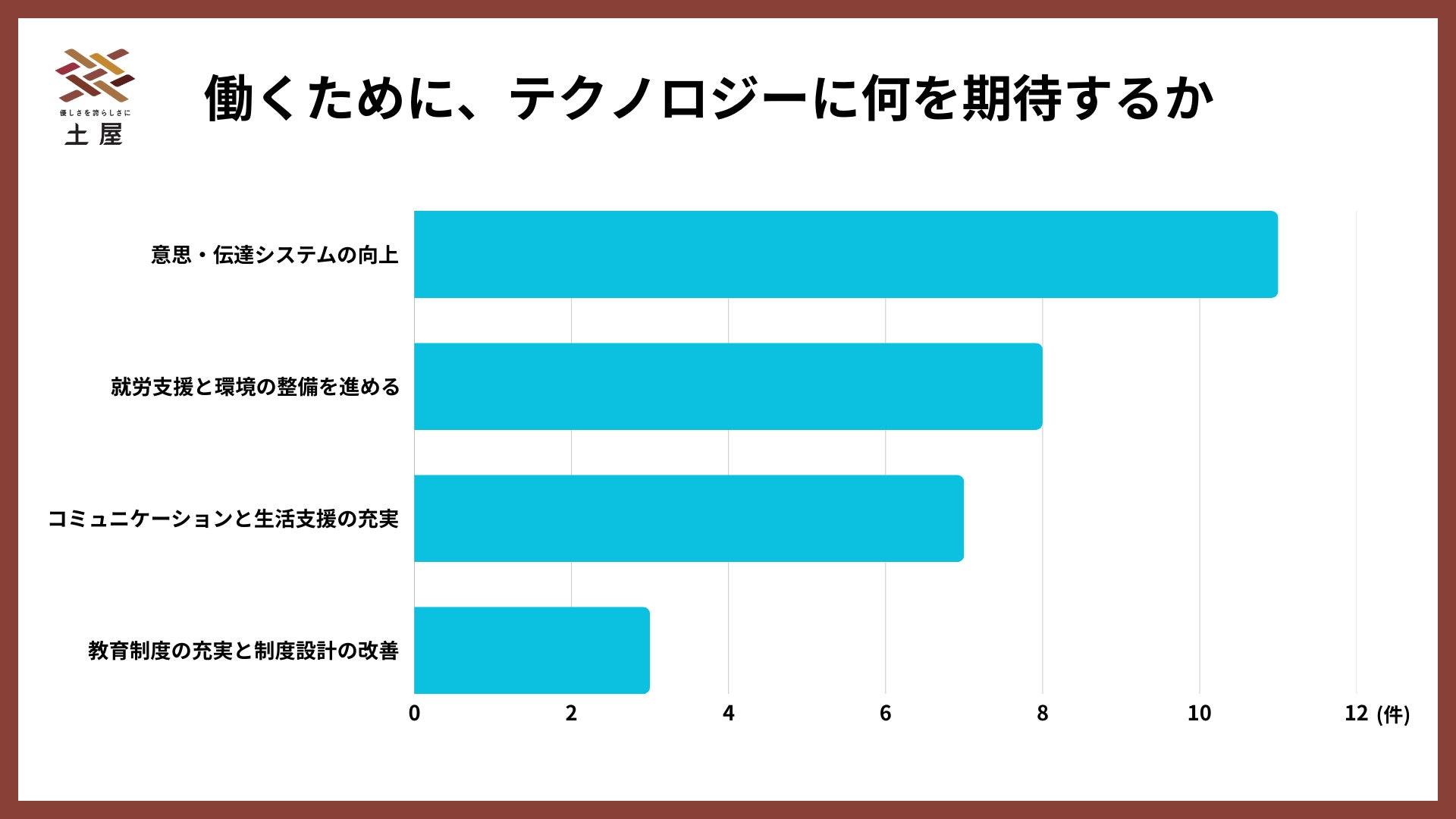 就労支援におけるテクノロジーへの期待は、「意思・伝達システムの向上」が最も高く(約11件)、次いで「就労支援と環境の整備」(8件)という結果に。