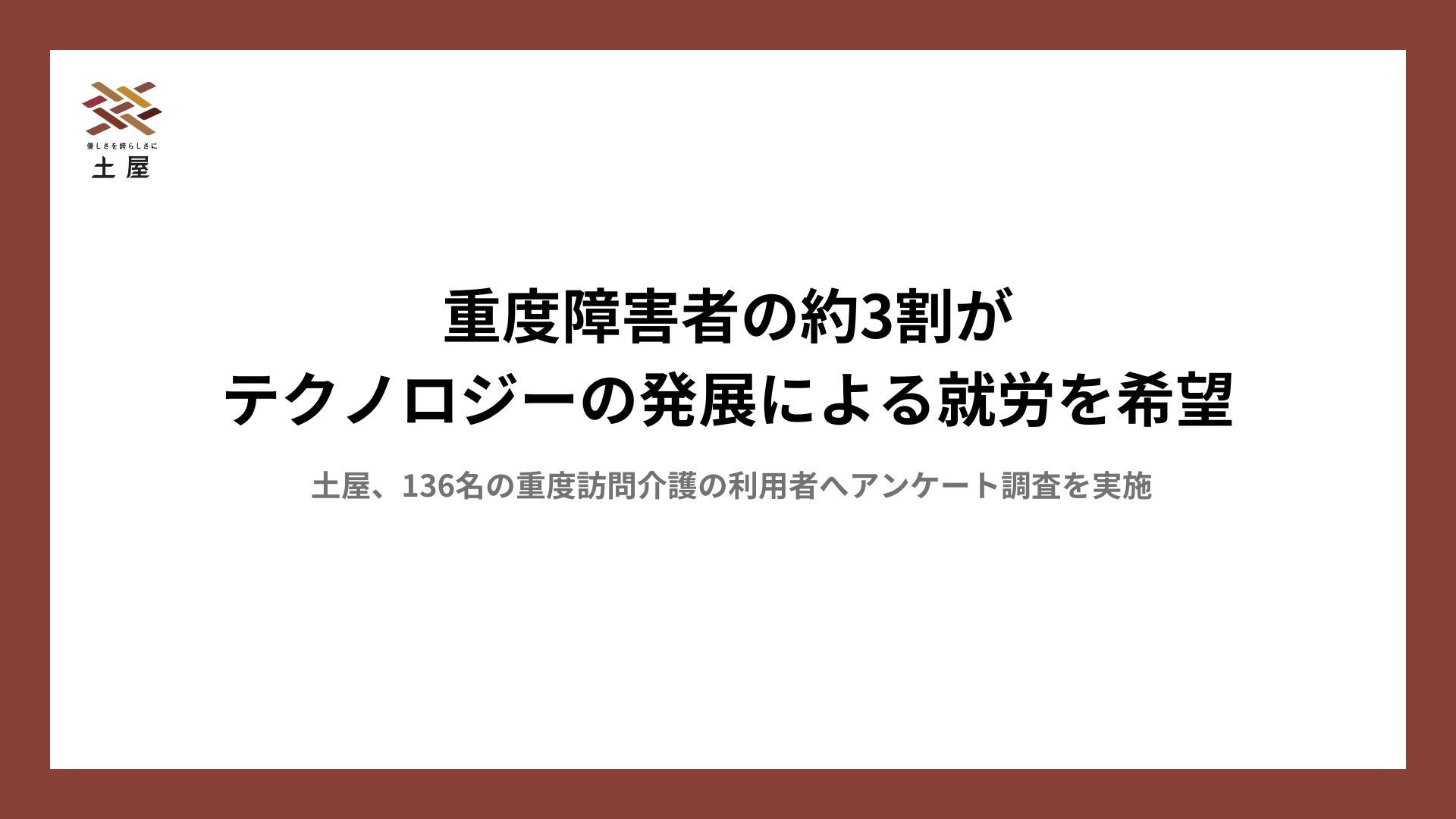 介護のトータルケアカンパニーとして全国47都道府県で障害をお持ちの方や高齢者に対して介護サービスを展開する株式会社土屋は、当社の重度訪問介護(*1)のクライアント(利用者)に対してアンケートをお配りし、その内136名に「就労に関する意識調査」にご協力いただきました。本リリースでは、その結果を発表いたします。