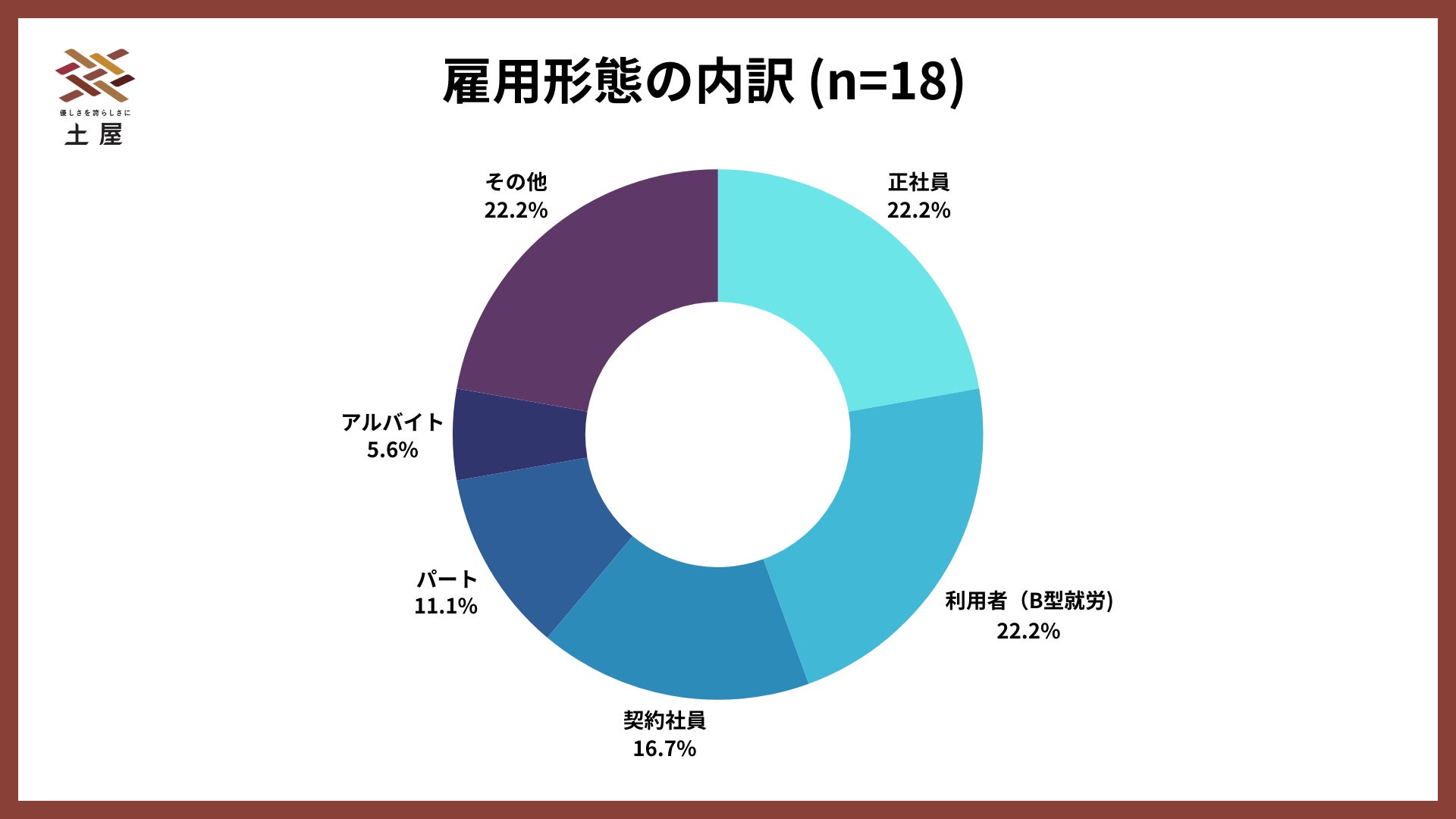 現在就労中の方は多様な形態で勤務しており、正社員・B型就労(各22.2%)が最多。