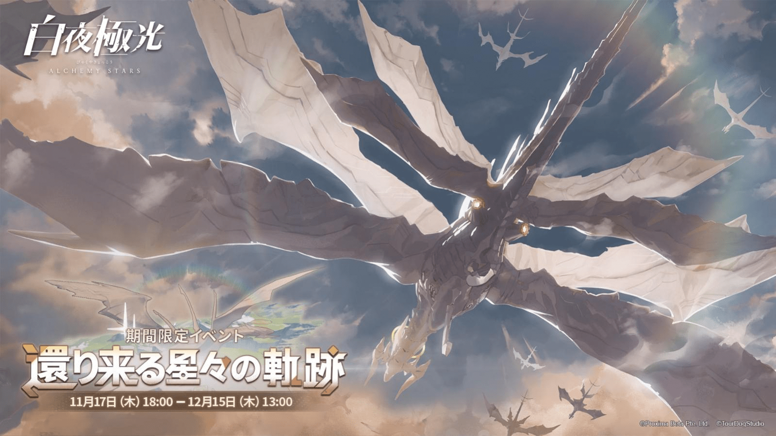 幻想的かつユニークなストーリー、美麗なグラフィック、豪華声優陣による個性豊かなキャラクター等で話題となり、ローンチとともにApp StoreとGoogle Playでランキング1位に輝いた『白夜極光(びゃくやきょっこう)』。11月17日(木)から【還り来る星々の軌跡】を開催します! 今回のアップデートでは新光霊の登場、お試しステージ、天空ノ庭外伝【破天の一投】、ログインボーナスはもちろん、なんと新メインストーリーである第13章、第14章を解禁! 果たして光霊たちはどのような試練に立ち向かうことになるのでしょうか。