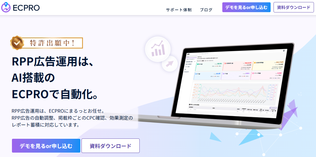 ECPRO(https://ecpro.ai/)は、楽天市場RPP広告の入札単価を自動調整するSaaSツールです。広告データの一元管理と自動入札機能により、店舗運営者の広告運用工数を大幅に削減します。
