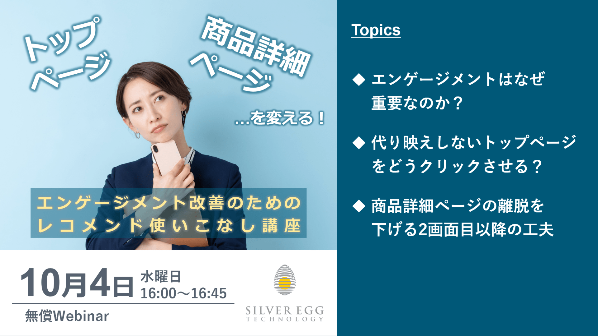 AI技術をベースとしたデジタルマーケティングサービスを提供するシルバーエッグ・テクノロジー株式会社(本社:大阪府吹田市、代表取締役社長&CEO:トーマス・フォーリー、証券コード 3961、以下 当社)は、2023年10月4日(水)にウェビナー「トップページと商品詳細ページを変える! エンゲージメント改善のためのレコメンド使いこなし講座」を開催します。