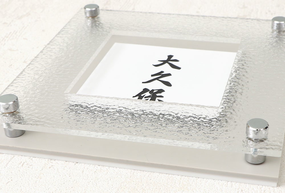 キラキラ輝く水面から名前が浮かび上がってくるような立体的なデザイン。ステンレス化粧を施したサインナットとガラスのようなアクリルのクリア感が涼しげでスタイリッシュ。近代的な住宅にはもちろん、和風住宅にもマッチします。プレートデザインは、12パターン。プレートデザインはシンプルなものから目を惹くデザイン15種を揃えています。対応フォントもオシャレで種類が多く、こだわった表札が出来上がること間違いなし。