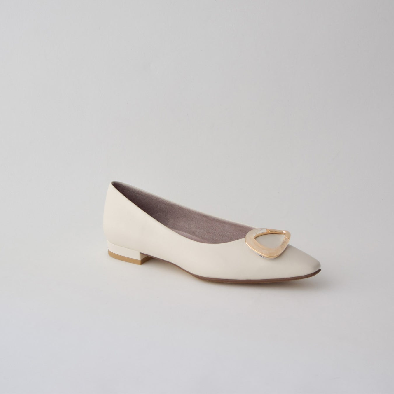 ボリューム感のある金具とゆるっとしたソフトなムードが今っぽいパンプス。有機的なフォルムでハードになり過ぎず、全体の優しげな印象にもマッチ。深めの履き口で包まれるような履き心地。