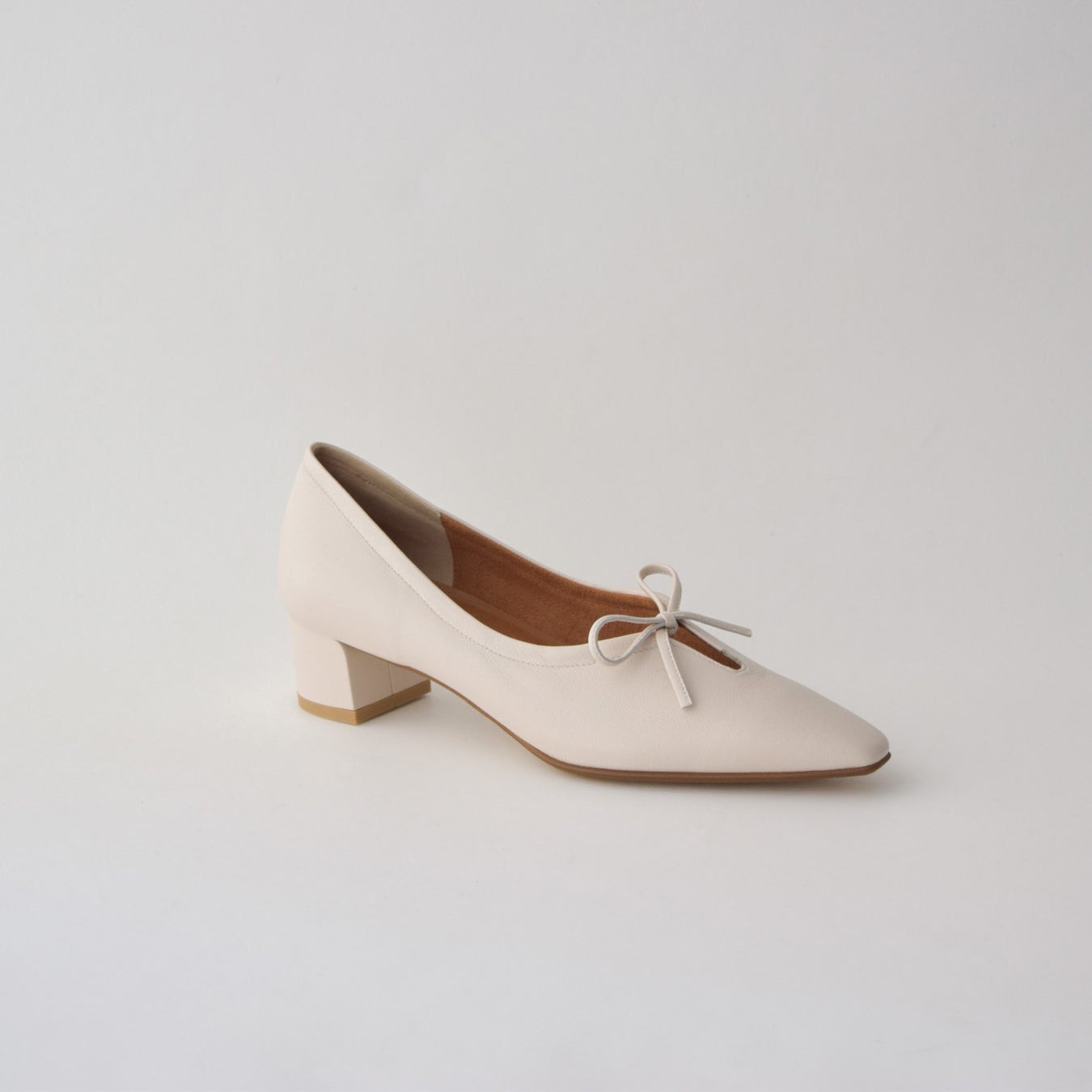 見た目も履き心地もソフトな質感のパンプス。安定感がありつつも太すぎないヒールですっきりした印象もあり、深めでモダンなカットにU字のスリットを入れることで抜け感もプラスしました。