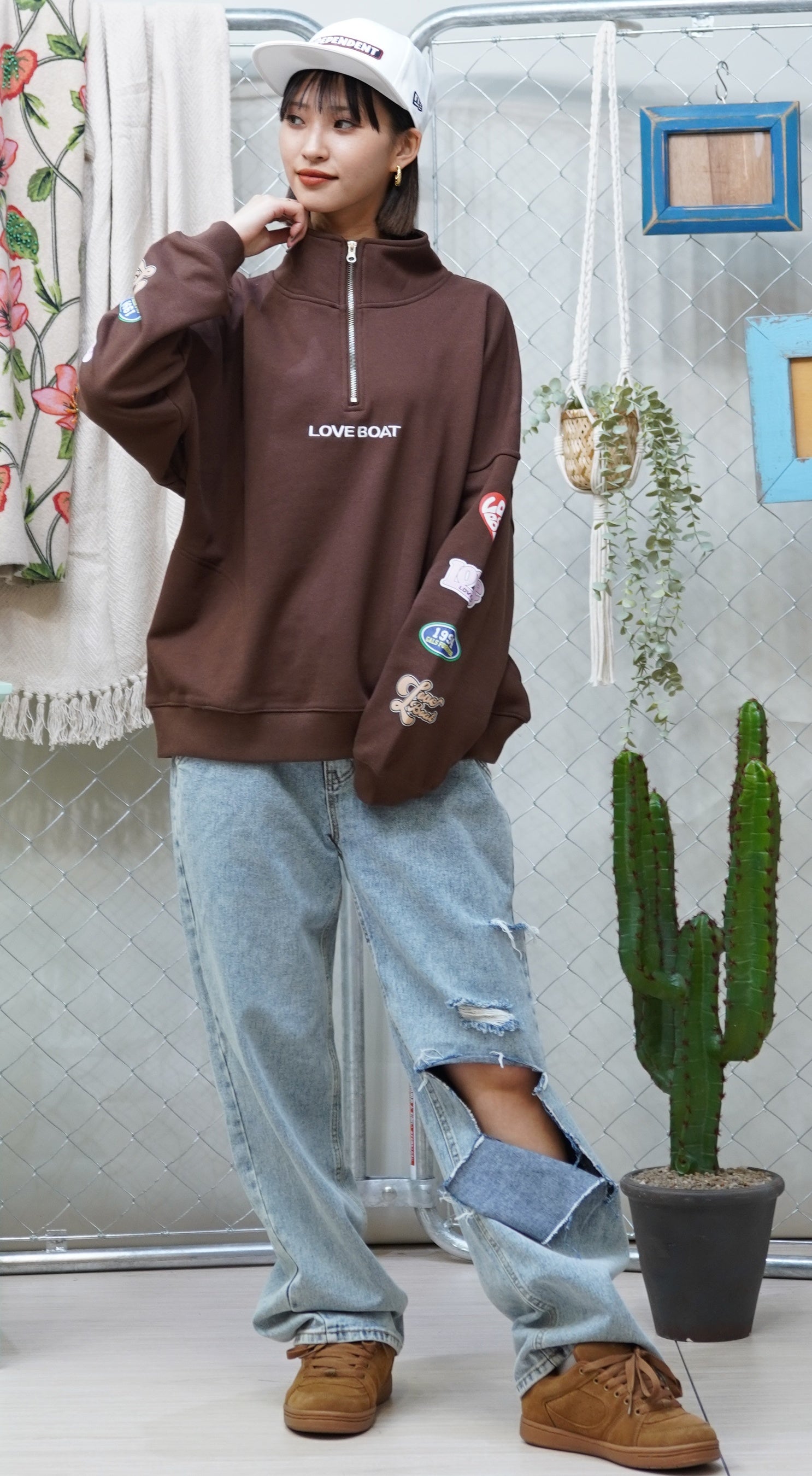 袖ロゴのステッカーの様なデザインがポイントになったハーフジップパーカーです。ボトムスにも合わせやすいボディカラーで柄ものにも相性抜群です。