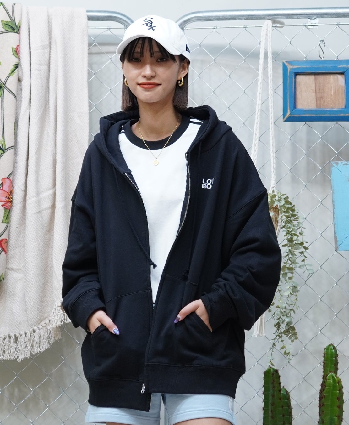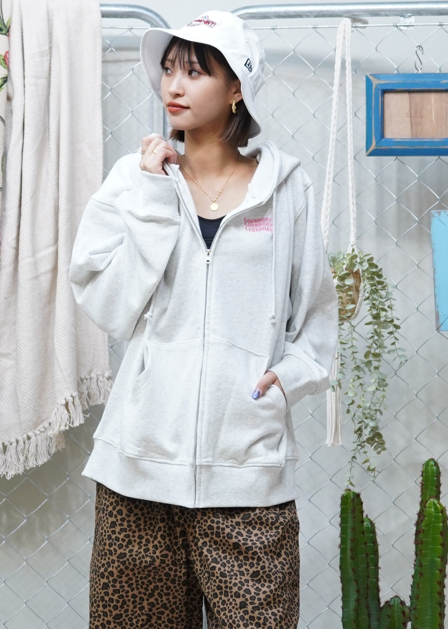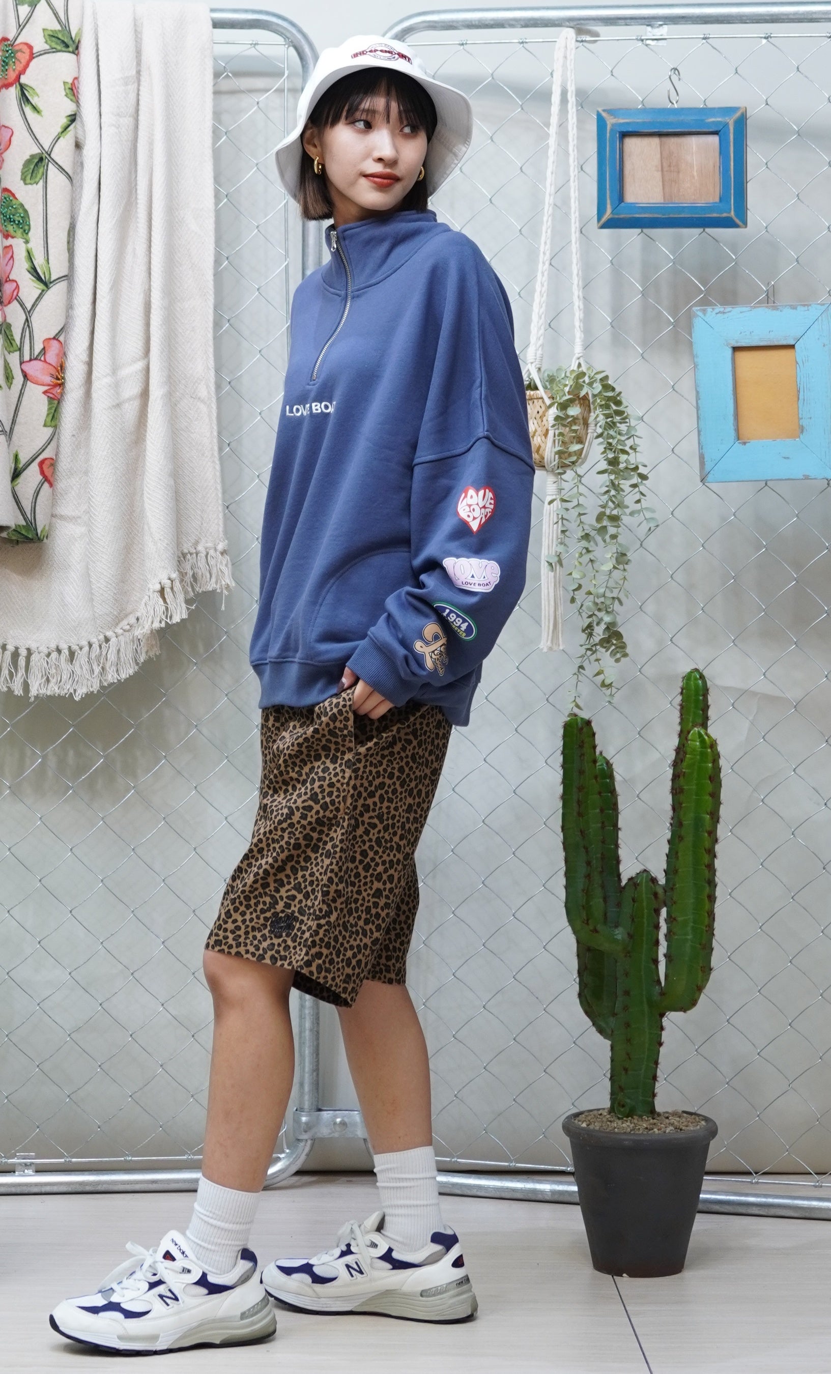 正面のシンプルなロゴに、背面はアニマル柄のロゴプリントが印象的なデザインになっています。スカート、パンツどちらにも合わせやすいオーバーサイズのパーカーです。