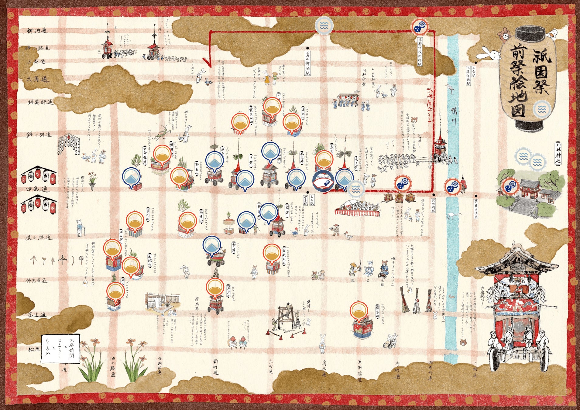 山鉾や個性豊かなキャラクターたちが祇園祭を楽しむイラストマップは見ても楽しい祇園祭期間中の神事や行事もマップ内で確認可能