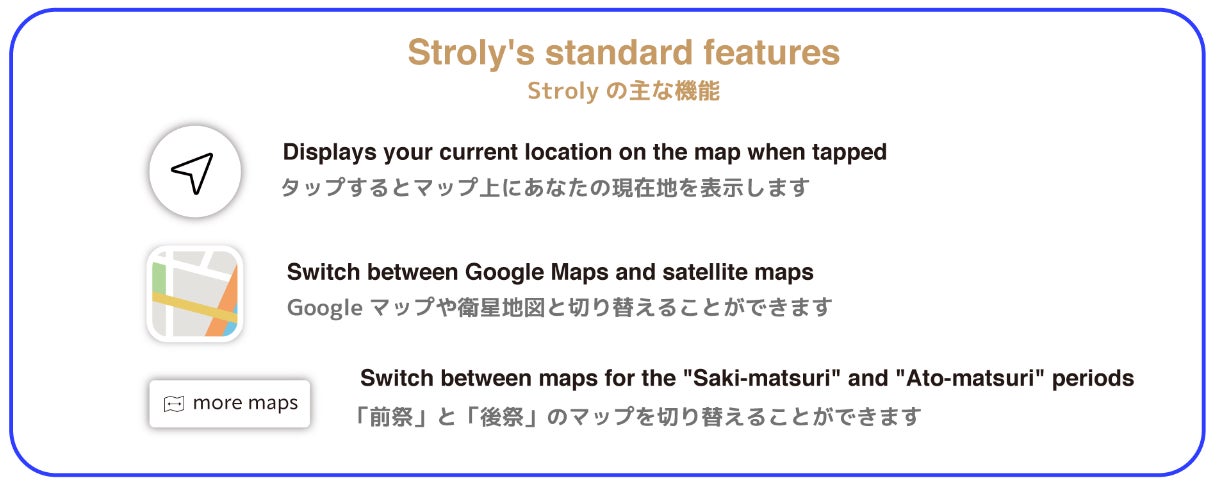 Strolyが運営するイラストデジタルマップ『Stroly』は、世界観を感じられるわかりやすいイラストを通じて、そのエリアのワクワクする情報に「出会って・知って・体験する」までを徹底的にガイドするマッププラットフォームです。日本各地の観光・祭りやイベント・エリアプロモーションをはじめ、世界11,000枚のイラストデジタルマップが存在します。おすすめのポイントやイベント情報を提供し、シールを貼るような感覚でイラストを配置するなど、マップをカスタマイズすることも可能です。さらに、マップの閲覧情報を元に、人流データや利用情報の可視化や、インバウンド対策としての多言語化対応にもなっています。