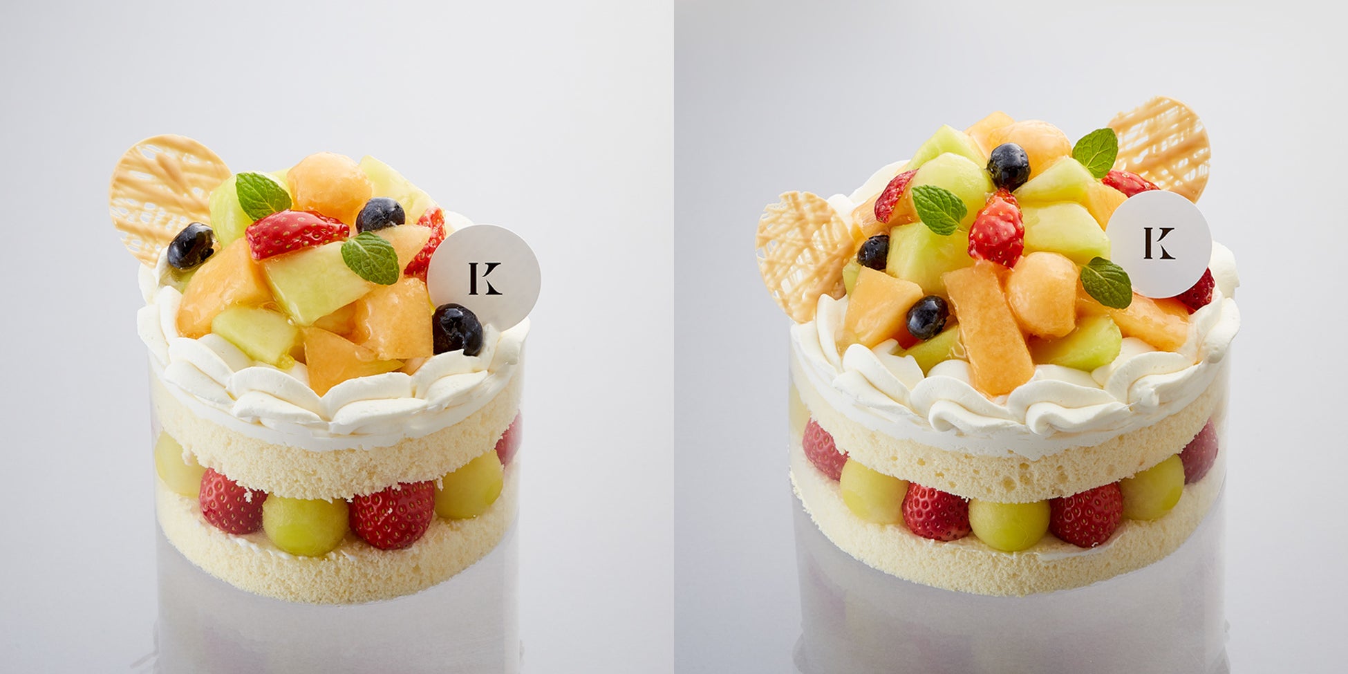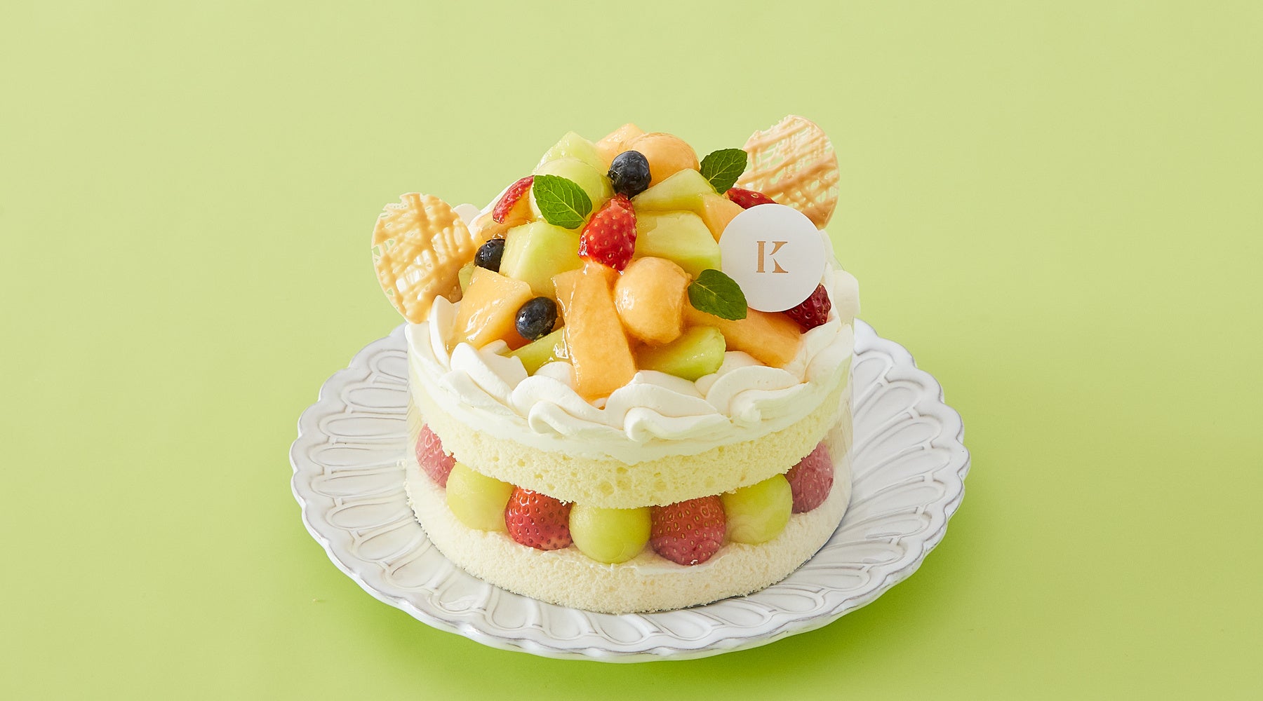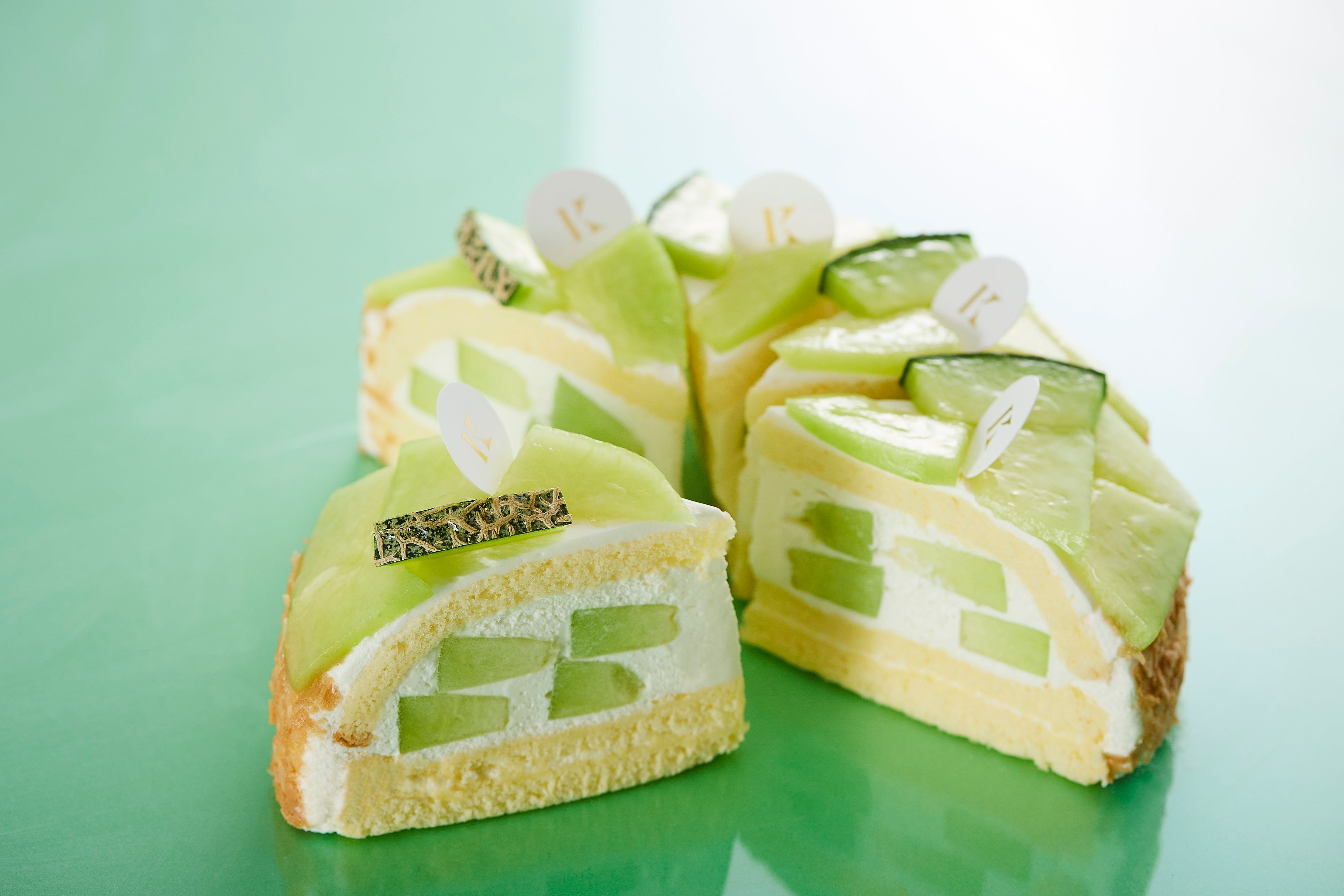 きめ細やかなスポンジに、スライスした2種類のメロンとフレッシュな生クリームをサンドし、側面には丸くくりぬいた青肉メロンとイチゴを華やかに飾り付けました。