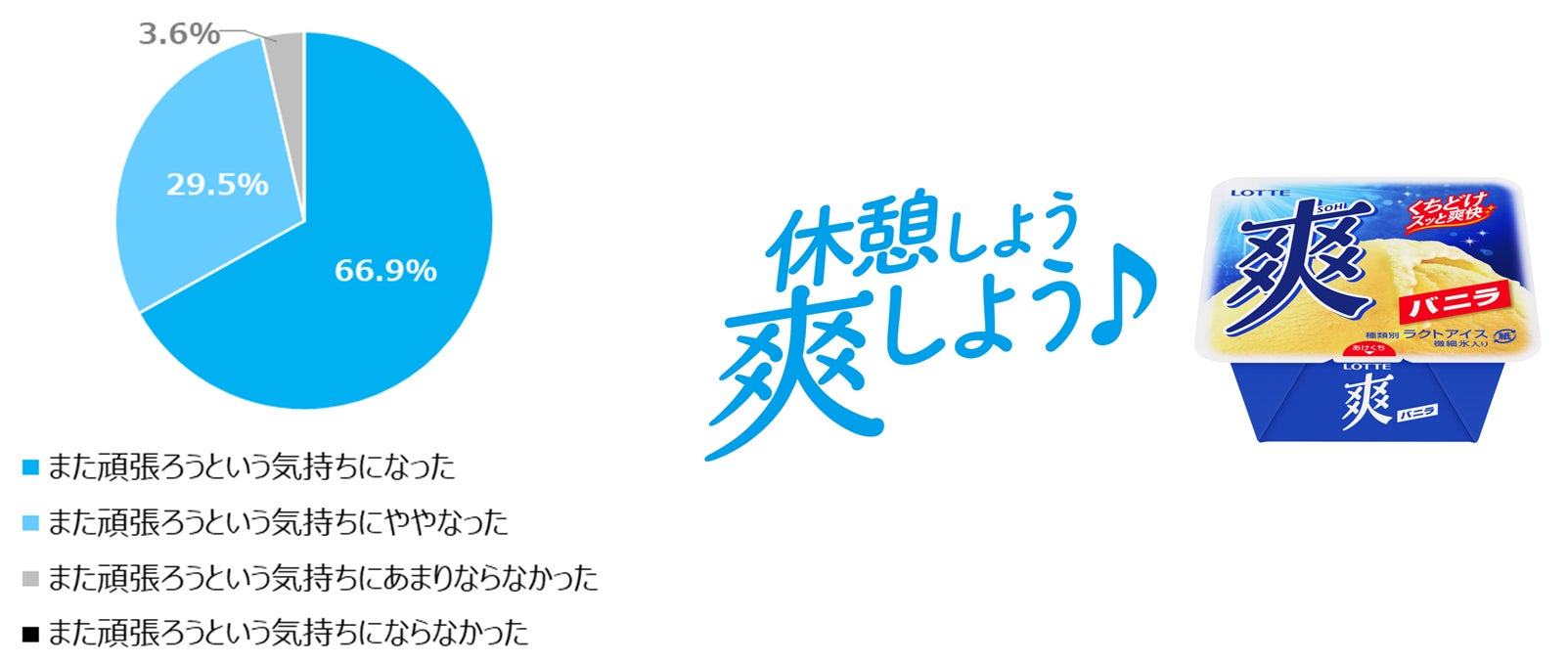 「休憩を取るきっかけになり、とてもよかった。」「気分転換になり、食べた後の集中力が上がった。」 「午後も頑張ろうと気持ちの切替になった。」「アイスを食べてリフレッシュすると作業効率が上がりそうだと思った。」