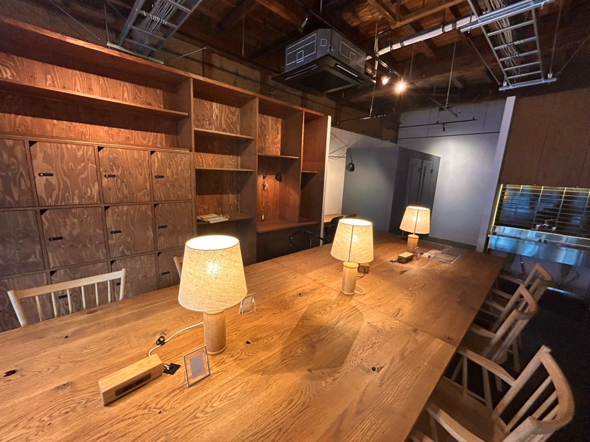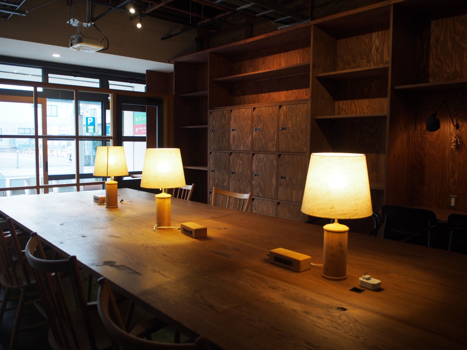 松江市の中心地・天神町商店街で歴史を見守ってきた木造建築をリノベーションしたコワーキングスペースです。歴史ある建物の風合いも残しながら、現代の働く世代が居心地よく使いやすい空間へと生まれ変わりました。一枚板で広々としたテーブルのオープン席、モニター付き会議室、半個室ブースと用途に合わせてお使いいただけます。個人・法人の会員利用もできますので、お気軽にお問合せください。
