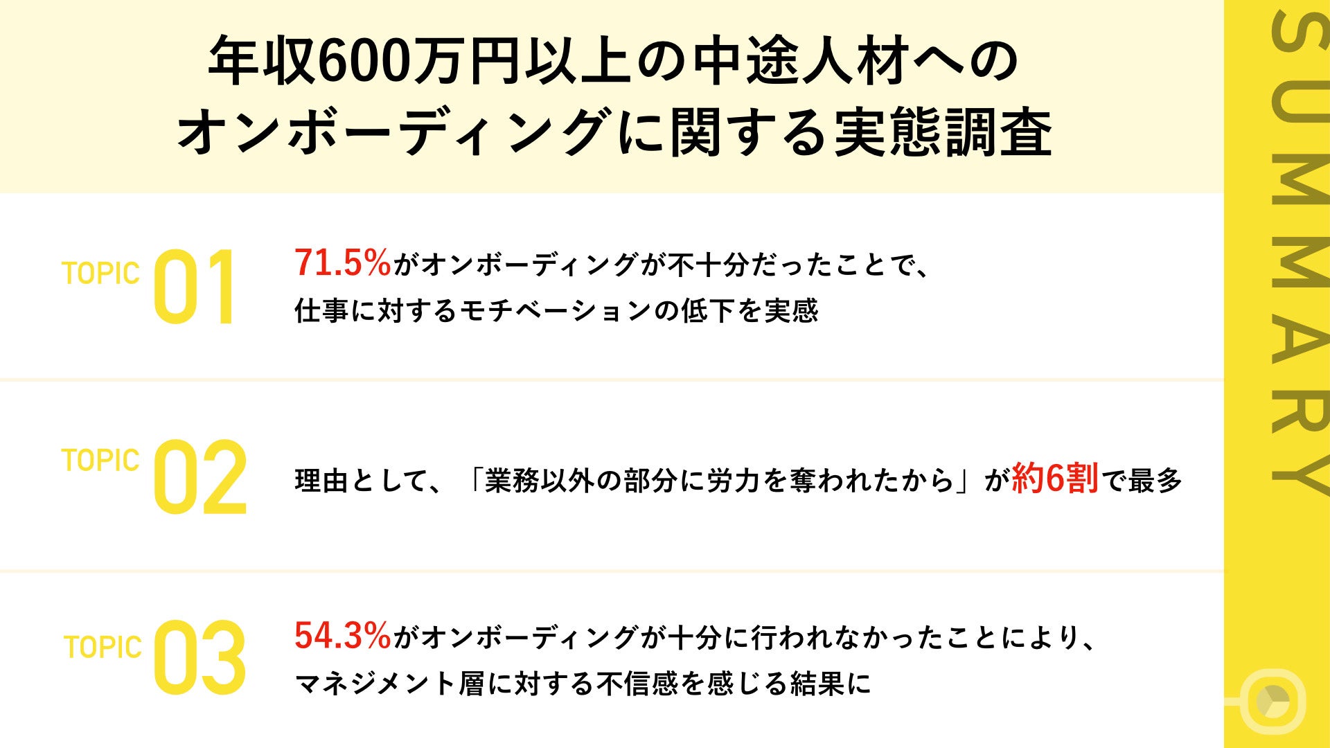 ユームテクノロジージャパン株式会社(本社:東京都港区、代表取締役:松田しゅう平、https://www.umujapan.co.jp、以下、ユームテクノロジージャパン)は、年収600万円以上の中途人材105名を対象に、年収600万円以上の中途人材へのオンボーディングに関する実態調査を実施いたしましたので、お知らせいたします。