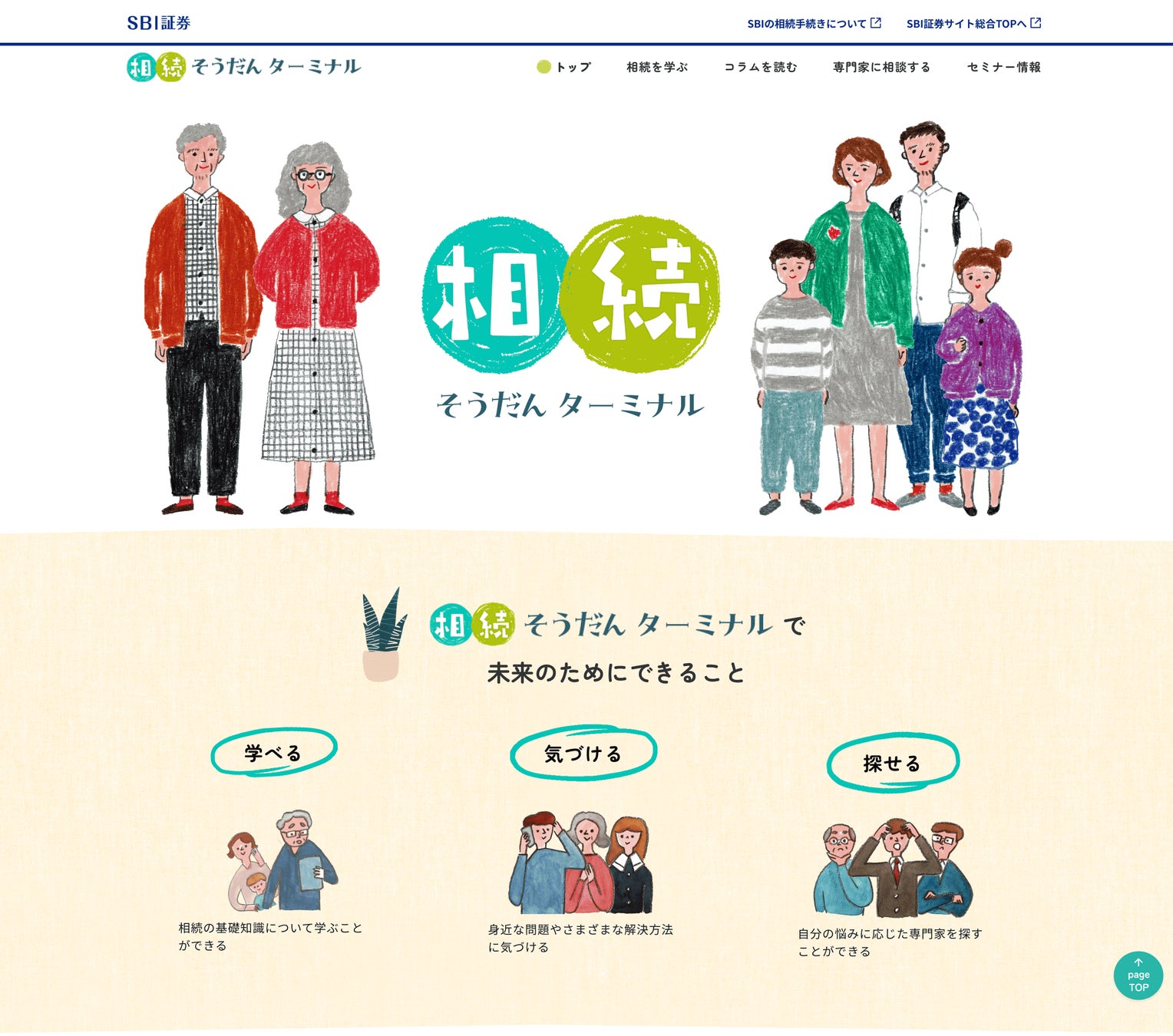 「相続そうだんターミナル」は、株式会社SBI証券が投資以外のお金の相談に関するサービス拡充の一環として2024 年 11 月 28 日に開設しました。「相続そうだんターミナル」は、ワンストップで相続に関する「学ぶ」、「気づく」、「探す」を実現できるサイトを目指しています。