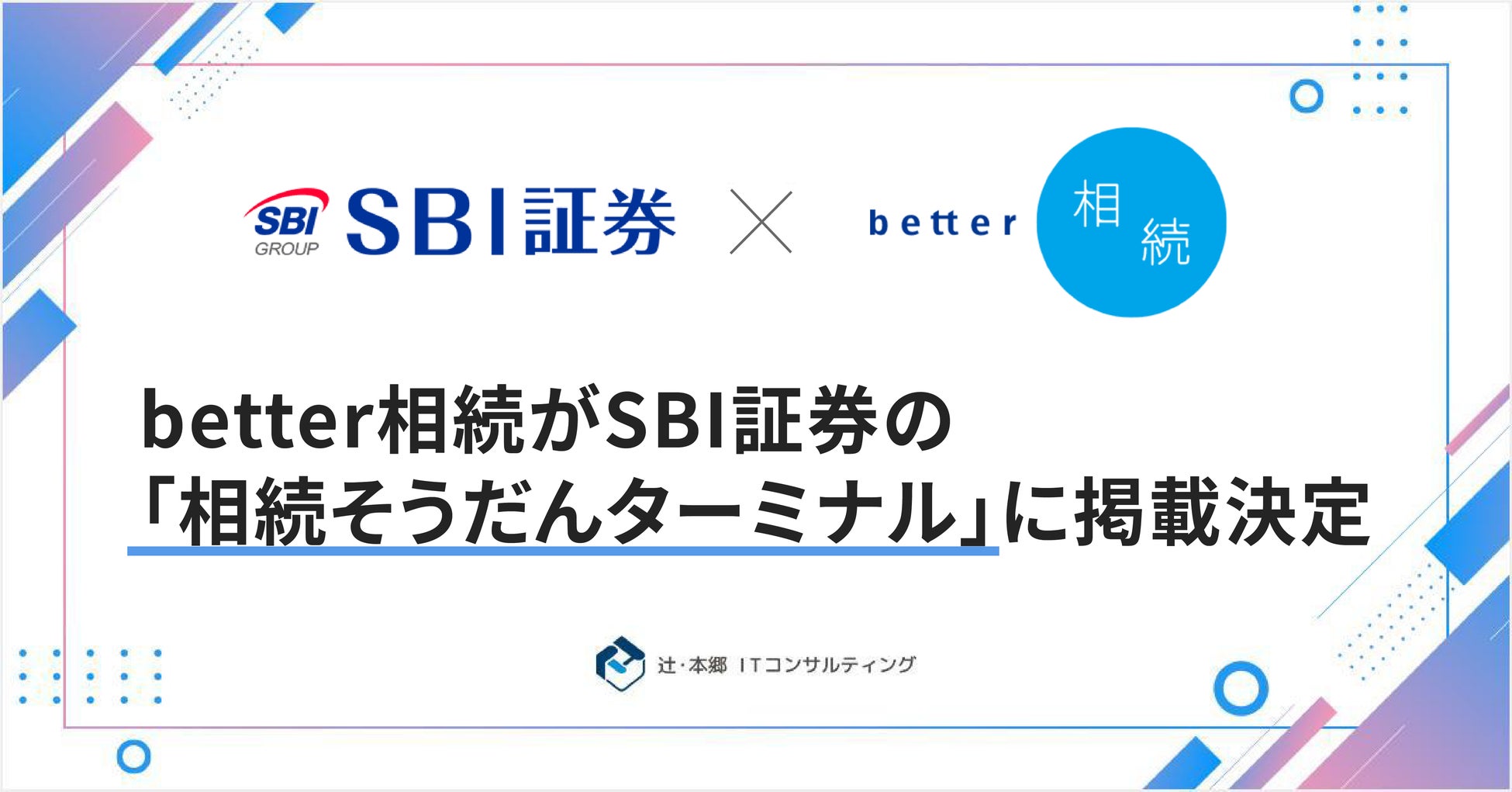 辻・本郷 ITコンサルティング株式会社(本社:東京都渋谷区、代表取締役社長:黒仁田 健、以下「当社」)は、当社が提供する相続手続き支援のWebサービス「better相続」が、株式会社SBI証券(本社:東京都港区、代表取締役社長:髙村正人)の運営する相続相談サイト「相続そうだんターミナル」に掲載されることとなりましたので、お知らせいたします。