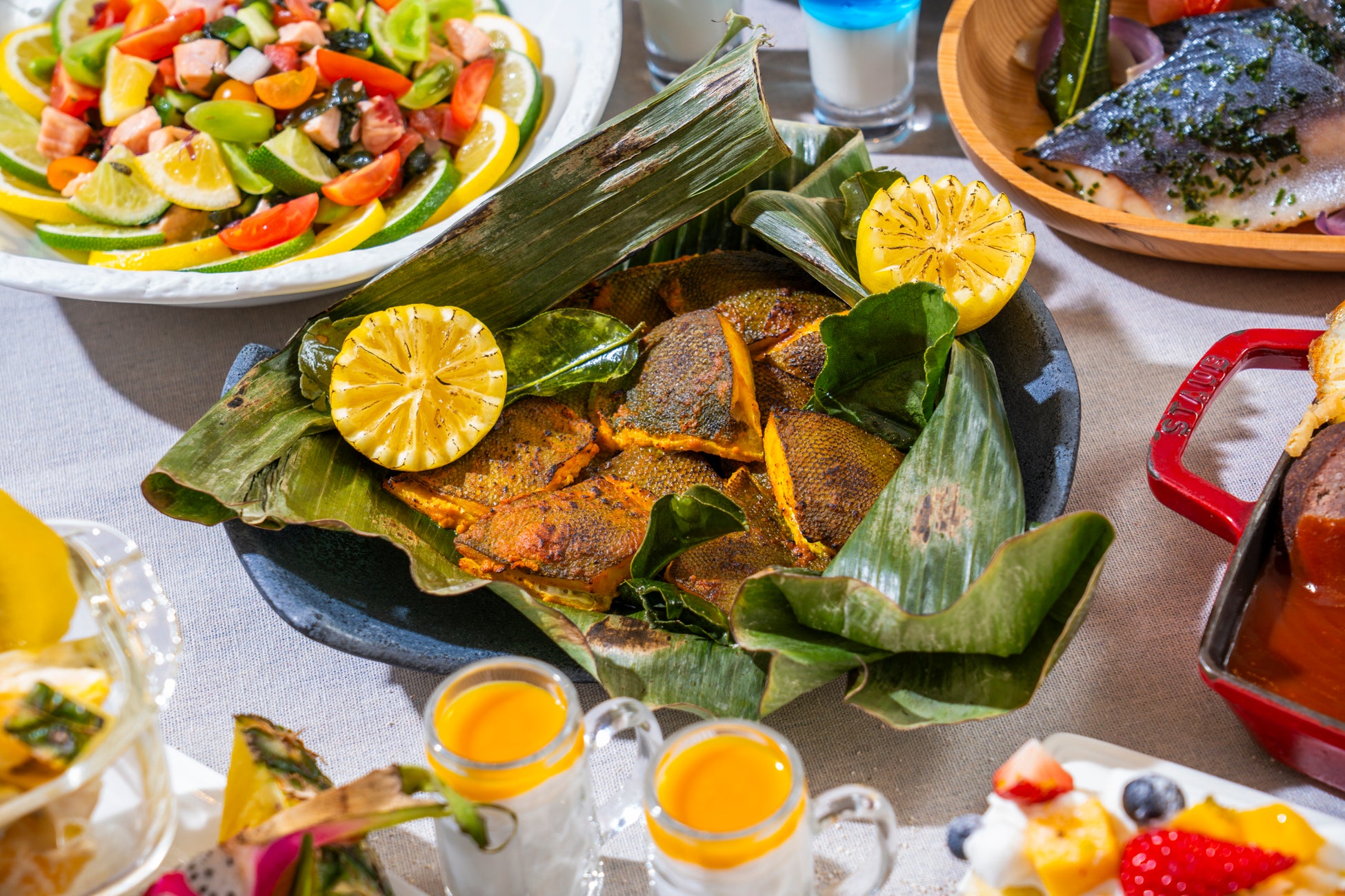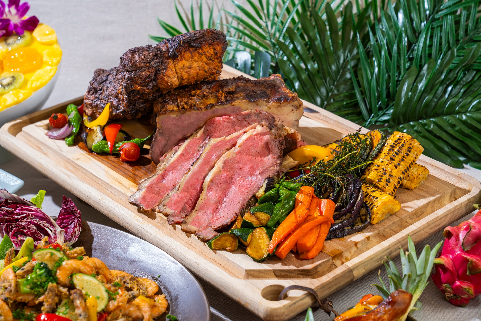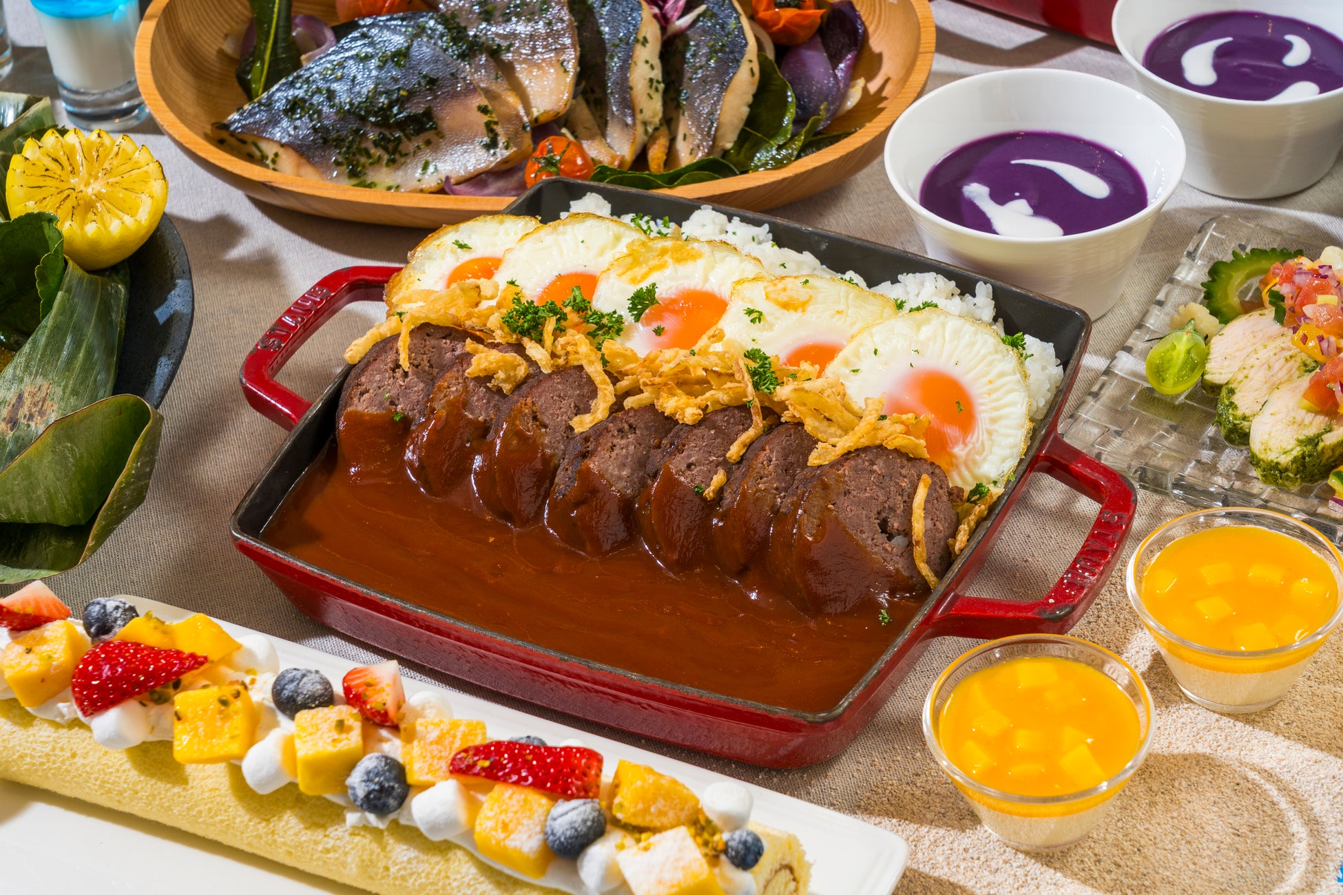 新鮮な魚の醤油漬けをご飯の上に載せた「ポケボール」や、香ばしさがお酒と相性ピッタリの「ガーリックシュリンプ」、「ロコモコ」などのハワイの定番料理から、サステナブルフィッシュを葉で包み蒸し焼きにした「ラウラウ」や特製ソースを何度も塗りながら焼き上げる「フリフリチキン」などの伝統料理まで、約10種類をラインアップ。ライブステーションには出来立てのパスタ「ジェノベーゼ」と見た目も夏らしく爽やかな「冷製夏野菜のカッペリーニ」のほかに、パイナップルの甘味とチーズの塩味が抜群の「ハワイアントロピカルピザ」や、あっさりしたスープを用いたローカルヌードル「サイミン」などが登場。さらにカーヴィングステーションではケイジャンスパイスでマリネして仕上げた「ケイジャンマリネローストビーフ」をシェフが目の前でご提供。デザートには週末限定で開催中のスイーツビュッフェより選りすぐりのスイーツをご賞味いただけます。
