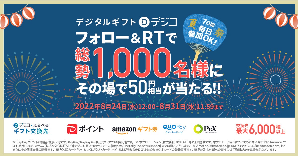 株式会社CARTA HOLDINGSのグループ会社で、マーケティングソリューション事業を展開する株式会社DIGITALIO (東京都渋谷区、代表取締役:古谷 和幸)が運営するデジタルギフト「デジコ」( https://digi-co.net/ )は、2022年8月24日~8月31日の期間中、デジタルギフト「デジコ」が総勢1,000名様にその場で当たる「デジコ夏祭りTwitterキャンペーン」を実施いたします。