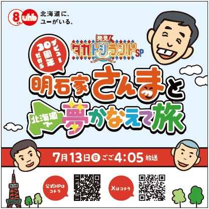 フジテレビ系列の北海道文化放送株式会社(北海道札幌市:https://www.uhb.jp/)は、『発見!タカトシランドSP 明石家さんまとデビュー30周年だから北海道で夢かなえて旅』を制作し、2025年7月13日(日)午後4時5分から、フジテレビ系列局(※一部除く)にて、全国放送することを決定しました。