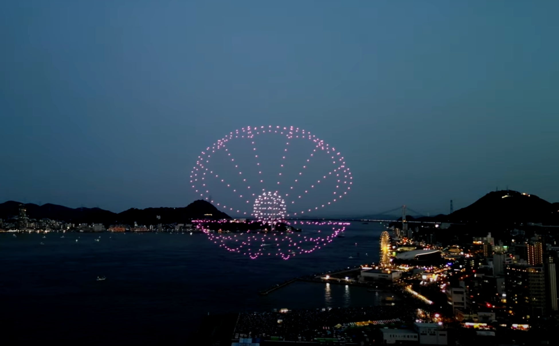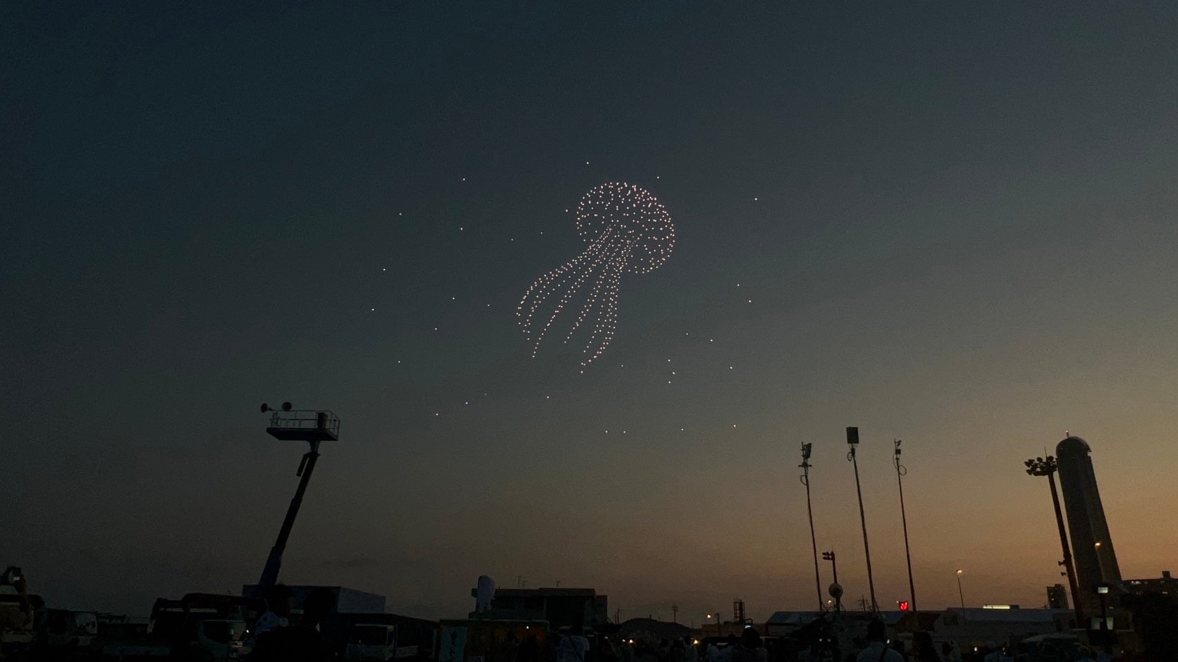 昨年の関門海峡花火大会でのドローンショーは、事前告知をしないサプライズ形式で実施。イルカやクラゲ、真珠貝など海にまつわるアニメーションが夜空に描かれると会場からは歓声が聞こえ、SNSでも感動の声が寄せられました。