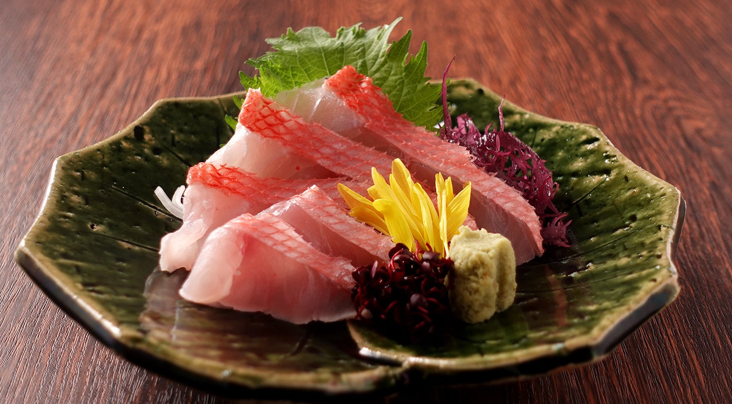 白身のお魚ですが濃厚な旨みがあり、ほんのりと甘く上品な味わいです。皮目をサッと湯霜した鮮度抜群のお刺身をお楽しみください。