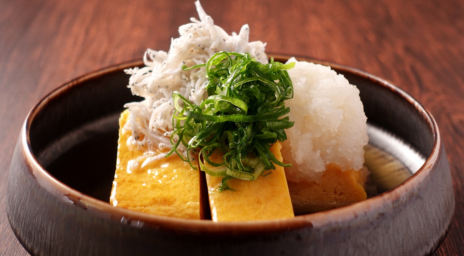 番屋で人気メニューの出汁巻き玉子に、熱々の美味出汁餡をかけ、ふっくらしらすと大根おろしと絡めてお召し上がりください。