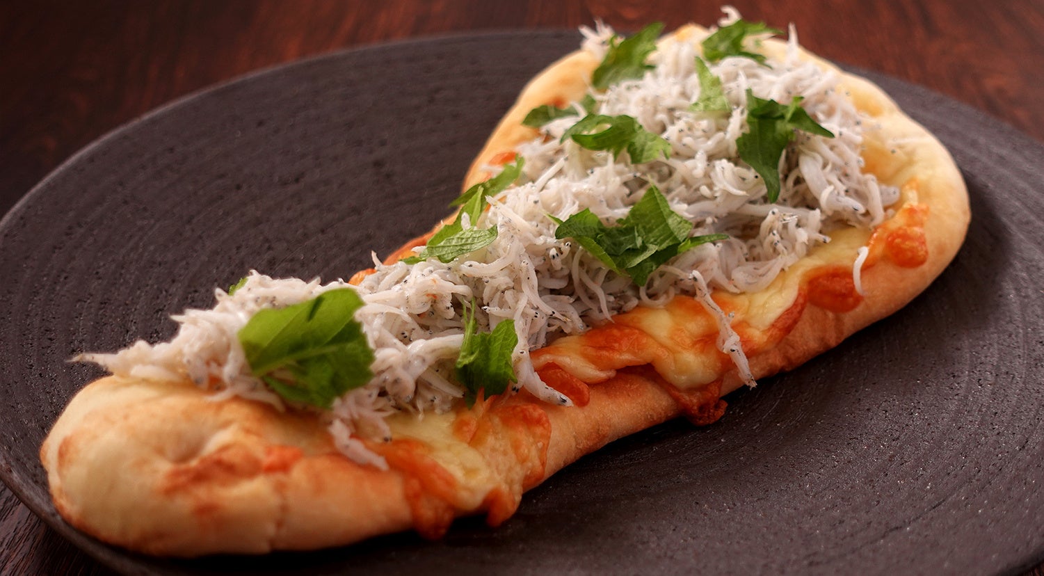 漁港から仕入れた鮮度抜群のしらすを焼き上がりにたっぷりと乗せた番屋オリジナルのピザです。大葉の香りが良いアクセントになり、チーズとの相性も抜群です。