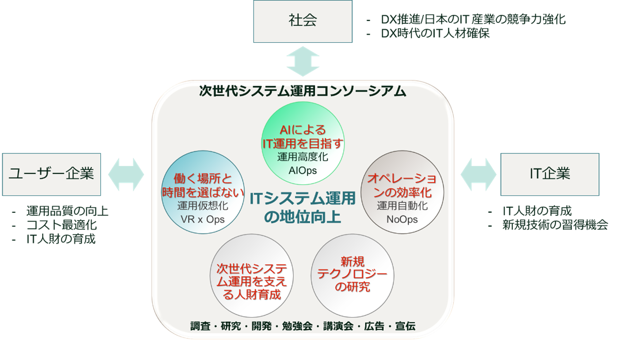技術の進化により、社会基盤がAIや仮想現実など高度なITに依存し、その結果システム運用の重要性が高まります。「次世代システム運用コンソーシアム」では、IT企業とユーザー企業が組織の垣根を越えて一丸となり、システム運用の高度化や自動化の推進、それを支える人財の育成に貢献する活動を行います。活動には以下の内容が含まれます。