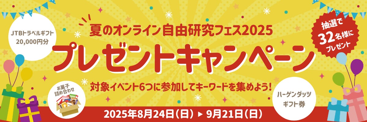 「夏のオンライン自由研究フェス2025」では、対象のオンライン授業全てに参加すると、抽選で賞品が当たるプレゼントキャンペーンに応募ができます。
