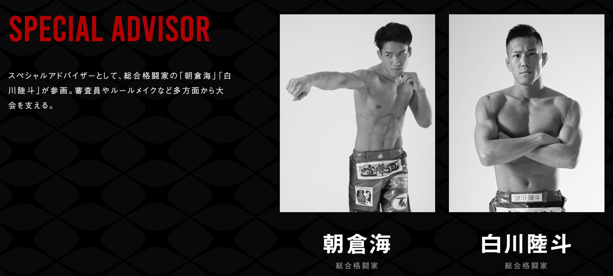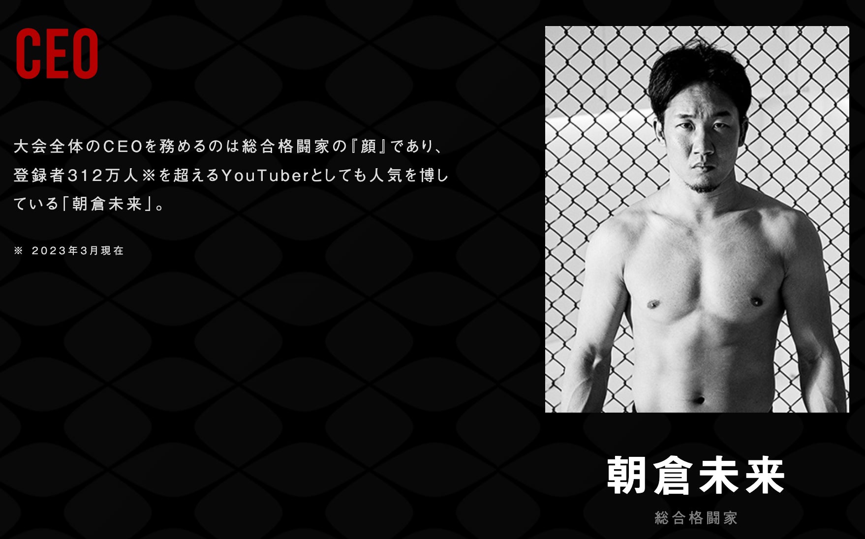 同大会は登録者数312万人超え(2023年3月現在)の人気YouTuberでもある総合格闘家の朝倉未来がCEOを務め、スペシャルアドバイザーとして総合格闘家の朝倉海、総合格闘家の白川陸斗が参画しています。