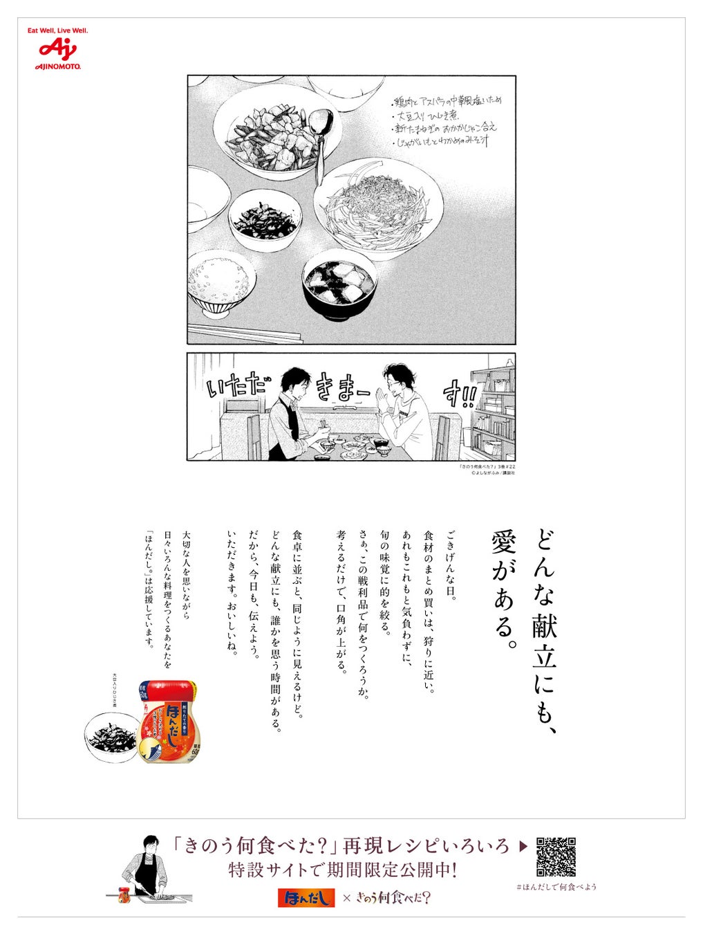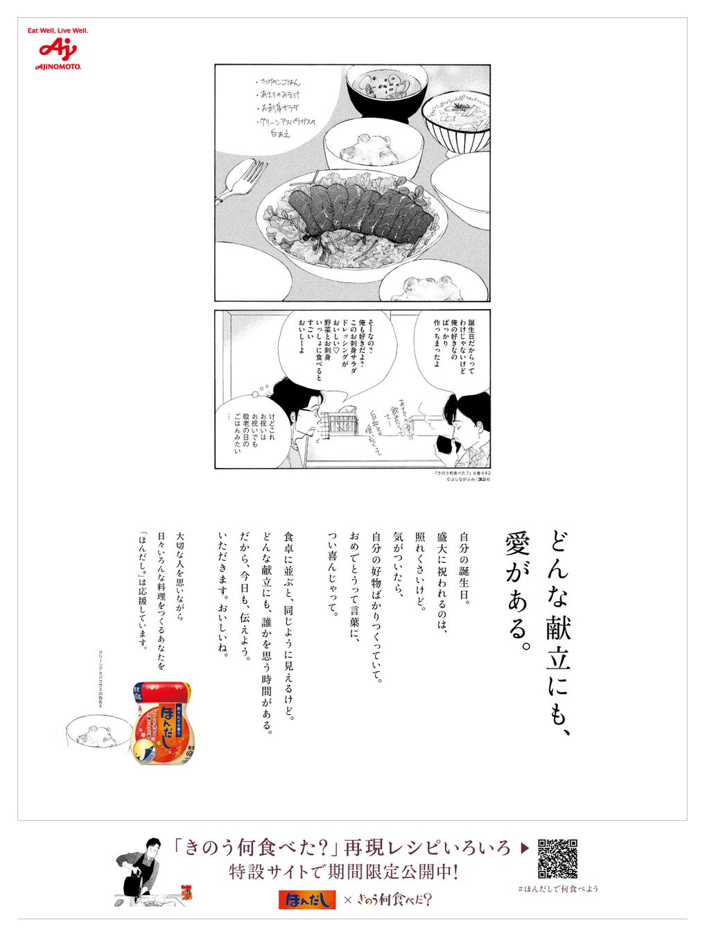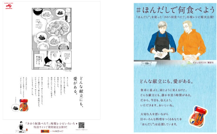 味の素株式会社(社長:藤江 太郎、本社:東京都中央区)は、当社の和風だしの素「ほんだし®」の、 “和風だしで毎日の食卓に安らぎやよろこびをもたらしたい、料理をつくる人を応援したい”というブランドコンセプトと、よしながふみ先生の人気漫画『きのう何食べた?』(講談社刊)で描かれている、“料理は、大切な人を思う時間”というメッセージを重ね、同作品とのコラボによる“どんな献立にも、愛がある。”をテーマとした企画を2024年8月1日(木)より開始します。