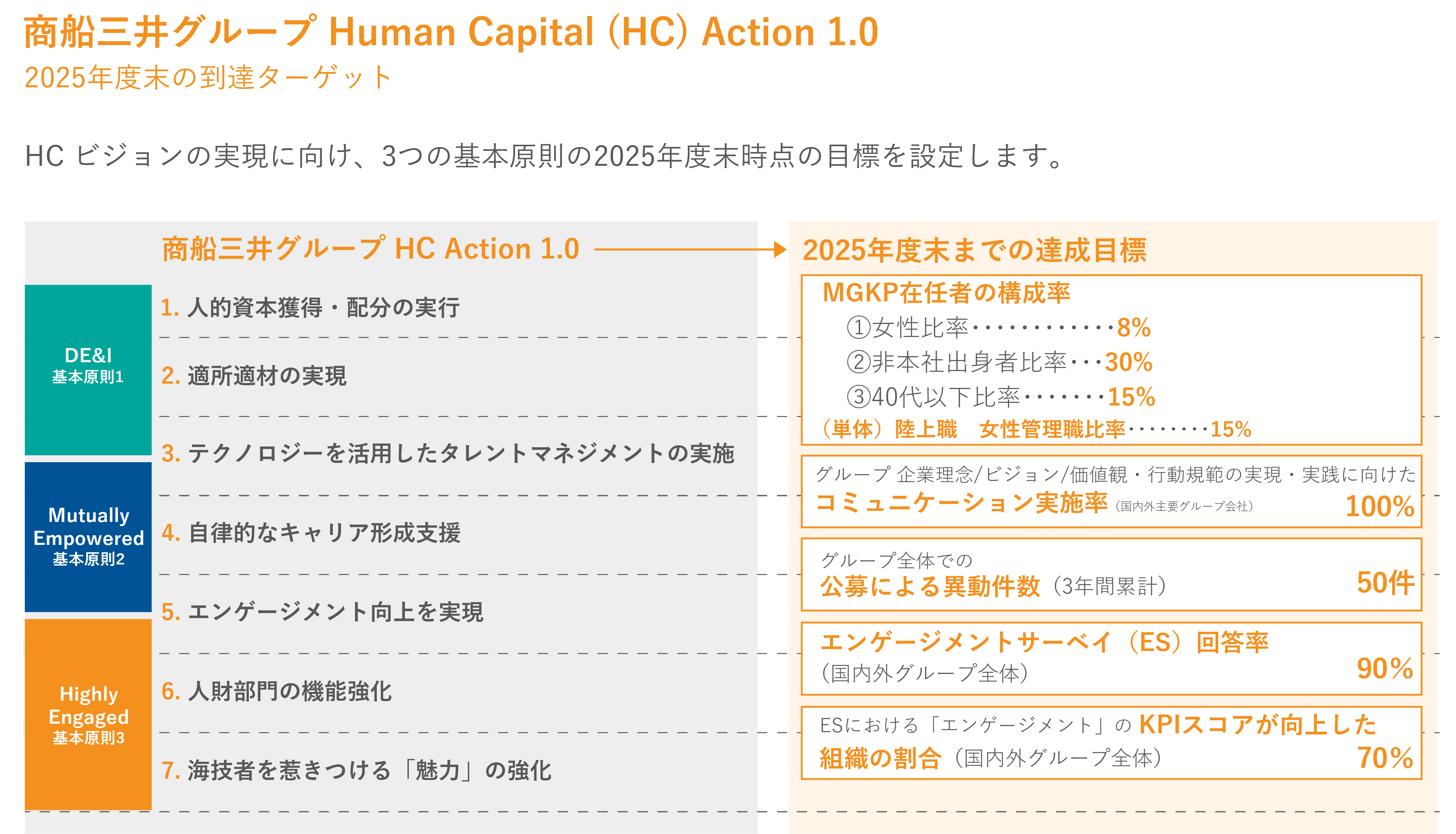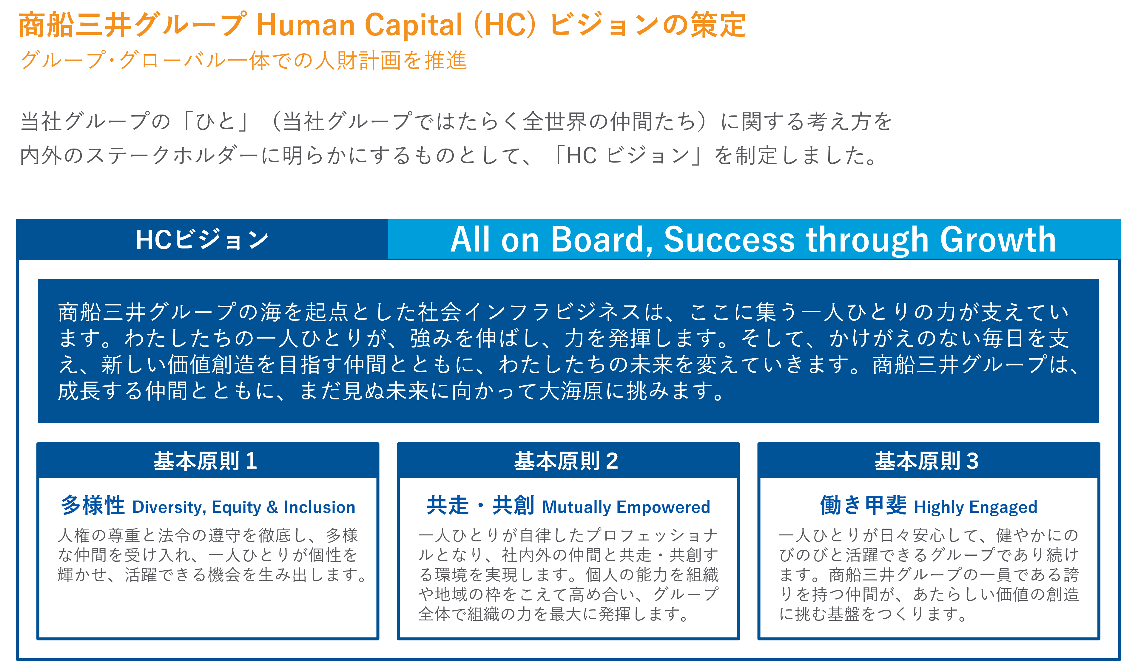 株式会社商船三井(社長:橋本剛、本社:東京都港区、以下「当社」)は、経営計画「BLUE ACTION 2035」にあわせて、当社グループの人財政策に関する基本的な考え方を示す「商船三井グループ Human Capital (HC) ビジョン」(以下「HCビジョン」)を策定しました。